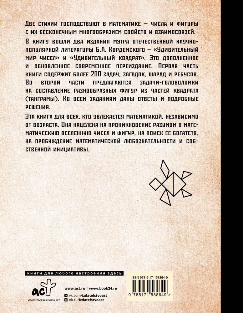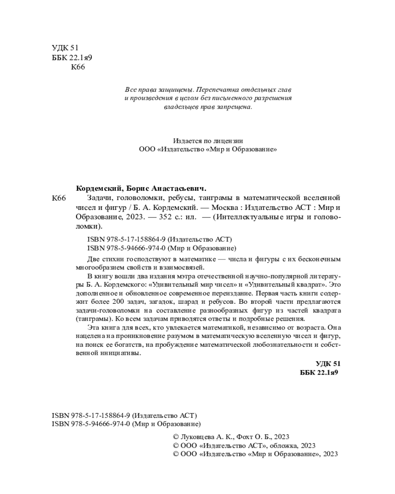 В книгу вошли два издания мэтра отечественной научно-популярной литературы Б. А. Кордемского «Удивительный мир чисел» и «Удивительный квадрат». Это дополненное и обновленное современное переиздание. Первая часть книги содержит более 200 задач, загадок, шарад и ребусов. Во второй части предлагаются задачи-головоломки на составление разнообразных фигур из частей квадрата. В конце книги приводятся ответы и подробные решения ко всем задачам.
