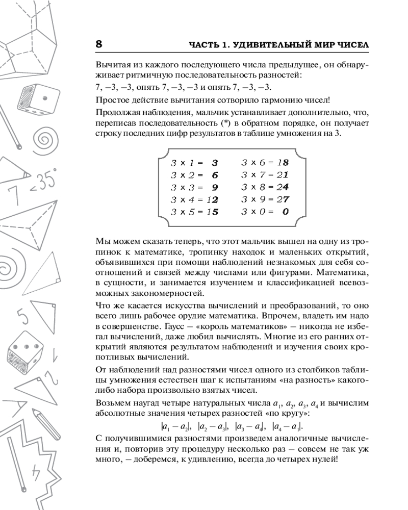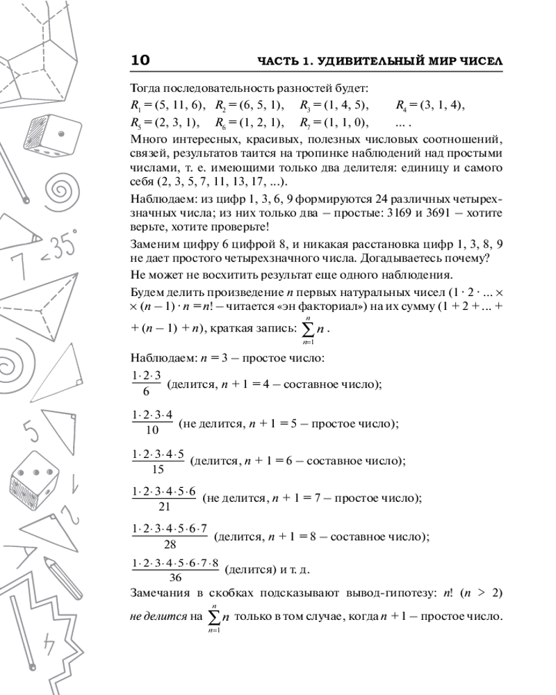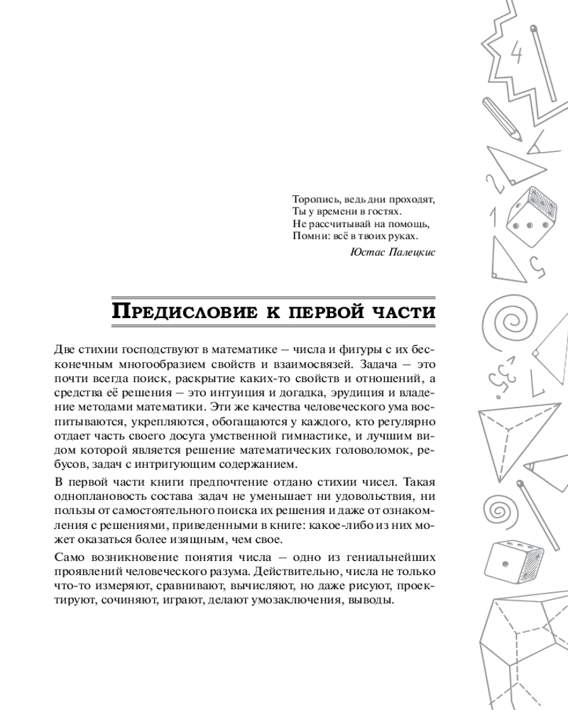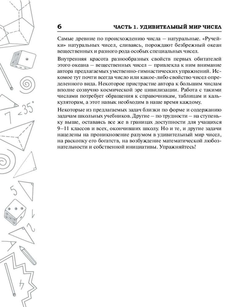 Эта книга для всех, кто увлекается математикой, — независимо от возраста. Она нацелена на проникновение разумом в удивительный мир чисел и фигур, на раскопку его богатств, на возбуждение математической любознательности и собственной инициативы. |