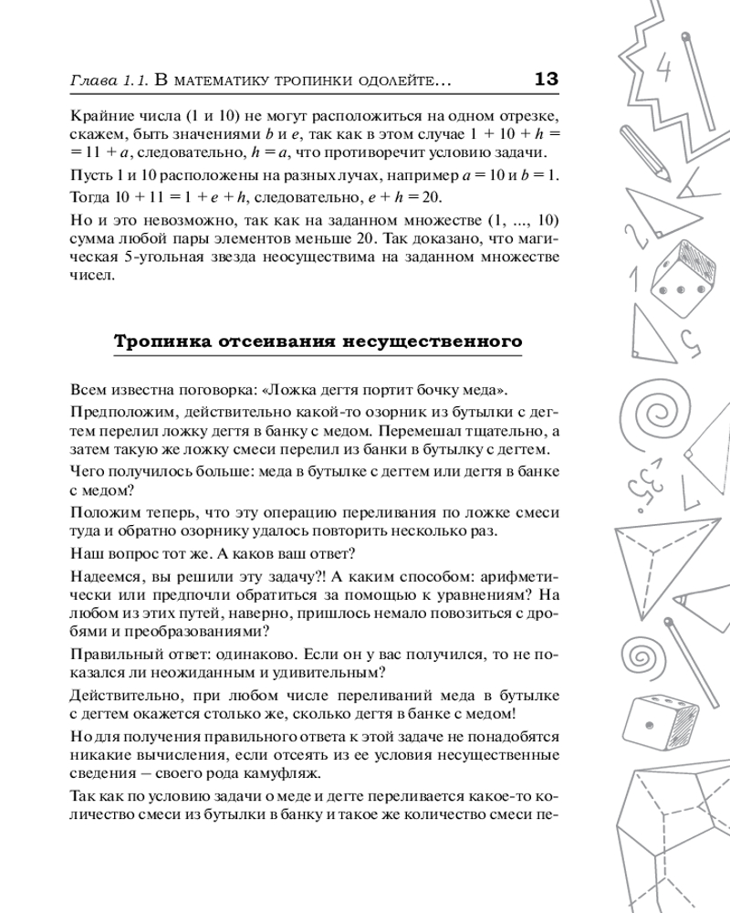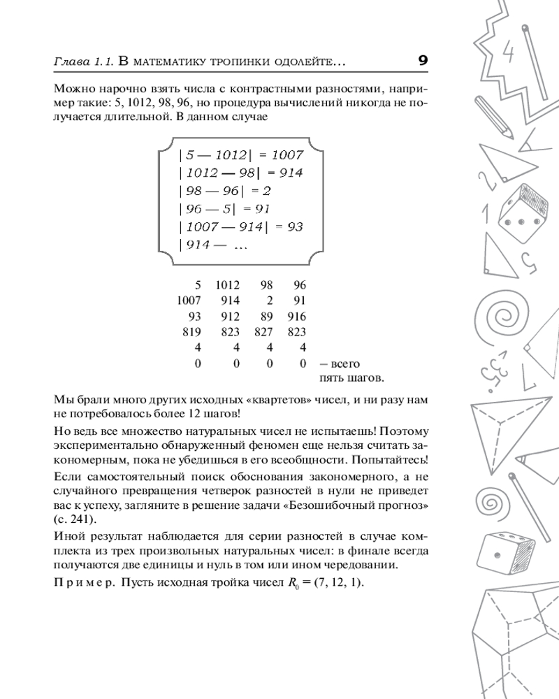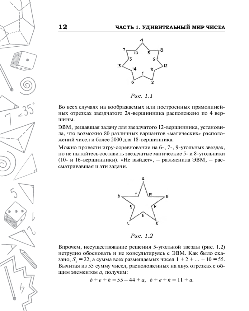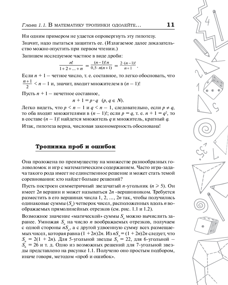 Эта книга для всех, кто увлекается математикой, — независимо от возраста. Она нацелена на проникновение разумом в удивительный мир чисел и фигур, на раскопку его богатств, на возбуждение математической любознательности и собственной инициативы. |