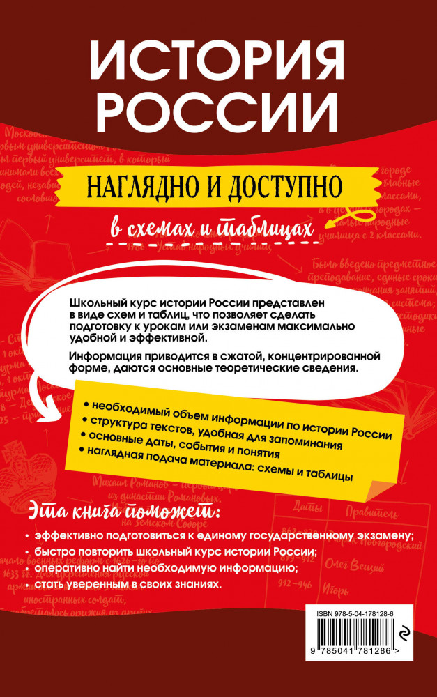 Школьный курс истории России за 6-11 классы собран в одной книге в удобной для запоминания форме. Информация представлена в наглядных схемах и таблицах, что позволит лучше понять и усвоить ее. Кроме того, с помощью пособия можно быстро найти любую тему и систематизировать уже имеющиеся знания.
