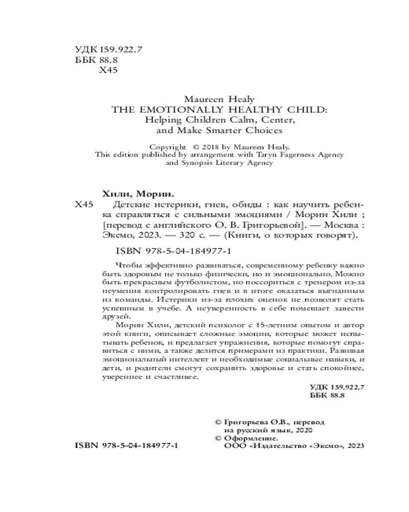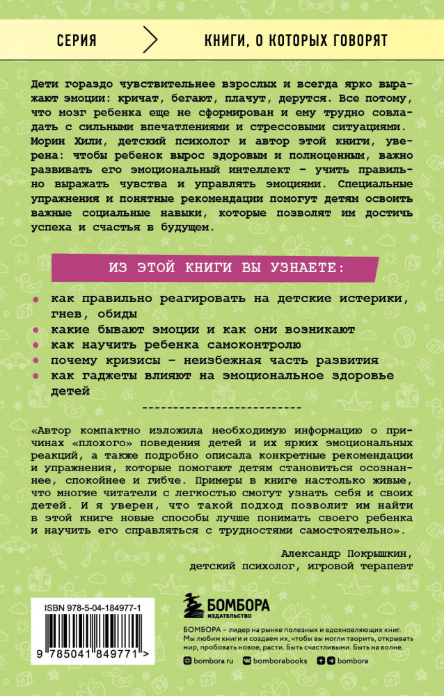 💳 Оплатить за товар можно при получении 🇰🇿 Есть бесплатная доставка по Казахстану от 1 дня 🎁 Копите бонусы с каждой покупки Серия: Книги, о которых говорят Дети гораздо чувствительнее взрослых и всегда ярко выражают эмоции: кричат, бегают, плачут, дерутся. Все потому, что мозг ребенка еще не сформирован и ему трудно совладать с сильными впечатлениями и стрессовыми ситуациями. |