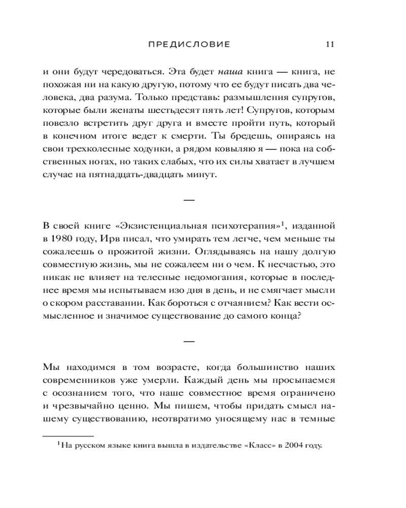 💳 Оплатить за товар можно при получении 🇰🇿 Есть бесплатная доставка по Казахстану от 1 дня 🎁 Копите бонусы с каждой покупки Серия: Ирвин Ялом. Мировые бестселлеры (обложка) У всемирно известного психотерапевта и писателя Ирвина Ялома было множество благословений в жизни — любящая семья, дом в Пало-Альто под великолепным дубом, большой круг друзей, преданные читатели по всему миру и долгий счастливый брак. Но и Ирвин Ялом не смог избежать встречи со смертью, когда у его жены Мэрилин был диагностирован рак. С мудростью прожитых лет и бесконечной любовью и уважением, Ирв и Мэрилин исследуют вопросы близости и горя. Чередуя рассказы о последних месяцах, проведенных вместе, и о первых месяцах, проведенных Ирвом в одиночестве, супруги Ялом предлагают нам редкую возможность взглянуть в лицо смерти и справиться с потерей любимого. |