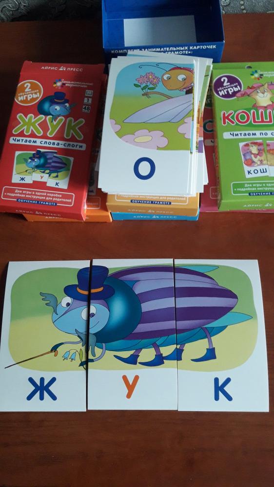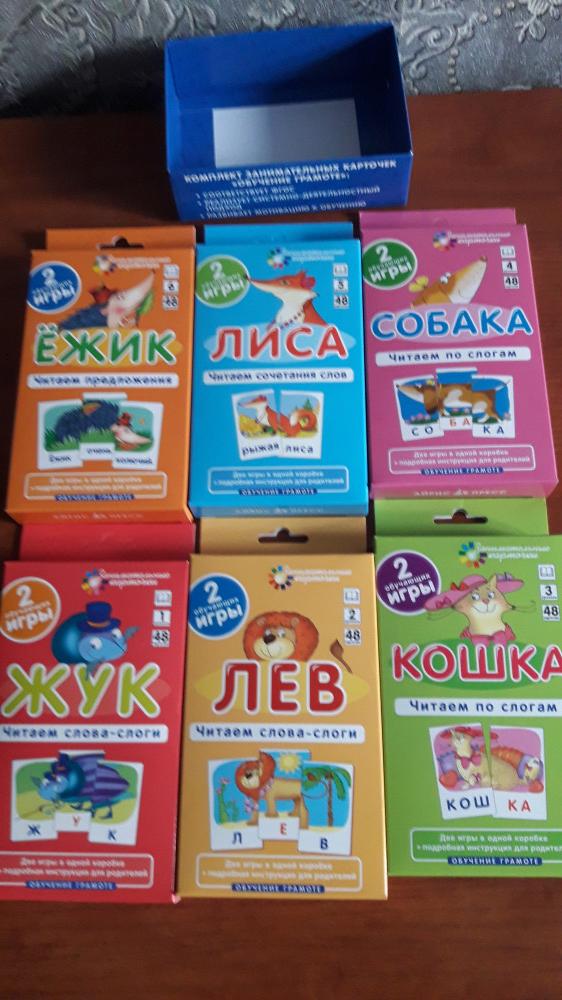 Отличные карточки, яркие картинки, много игр, можно придумать с ними свои игры. Разные уровни от простого к сложному. Есть черно белые рисунки и слова на обороте, на внимательность игра и тут же чтение слов. Набор порадовал. Удобная коробочка для хранения.