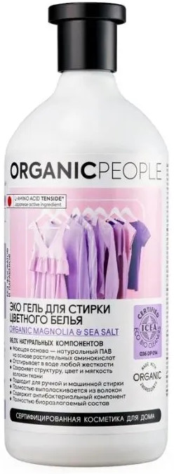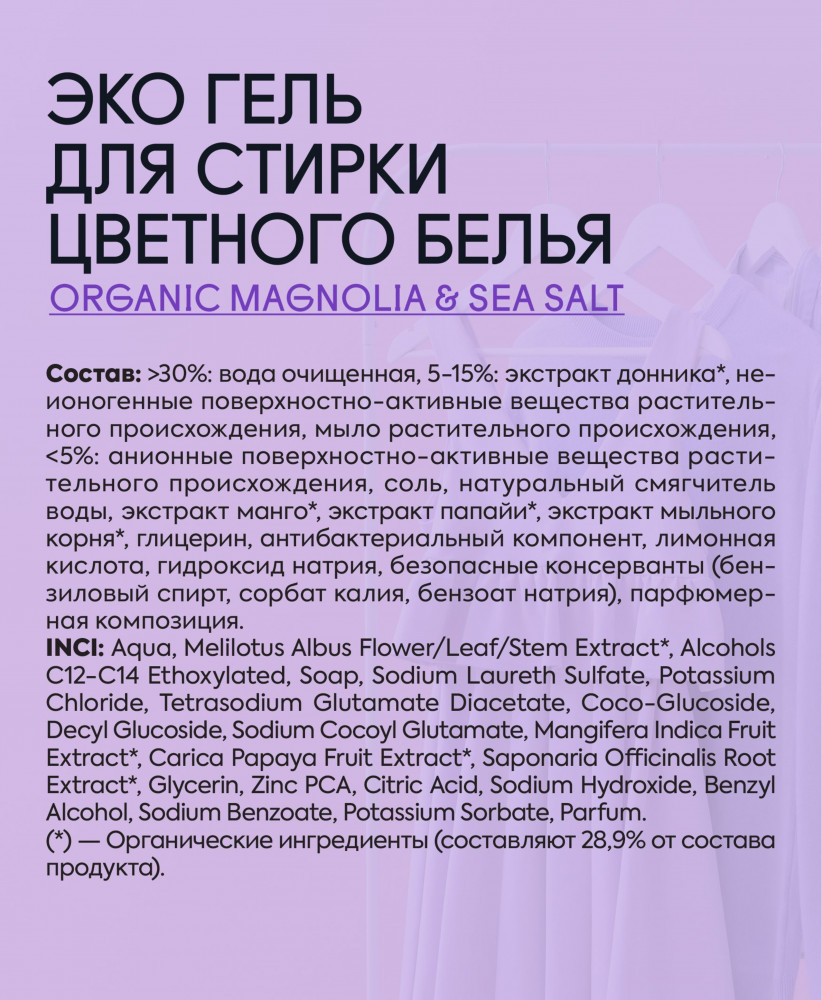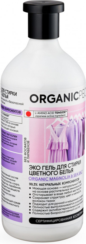 Эко гель создан для эффективной и безопасной стирки цветного белья. Средство прошло органическую сертификацию ECO BIO международного института ICEA. Содержит 99,3% натуральных компонентов. L-Amino Acid Tenside — японский ультрамягкий ПАВ на основе растительных аминокислот, которые являются безопасной моющей основой. Органический экстракт магнолии за счет большого содержания фитонцидов, является природным антисептиком. Содержит растительные кислоты, которые деликатно отстирывают цветные вещи. Морская соль надолго сохраняет яркость и структуру тканей: защищает от выцветания, придает насыщенность цвету и продлевает срок службы вещей.