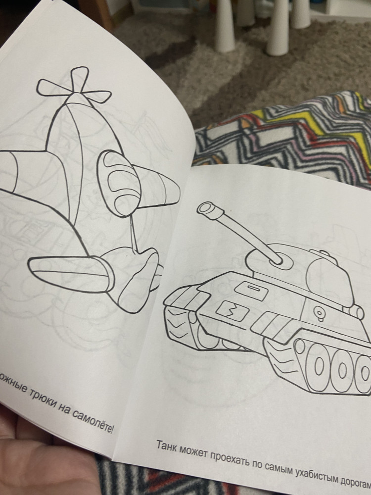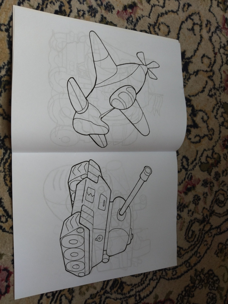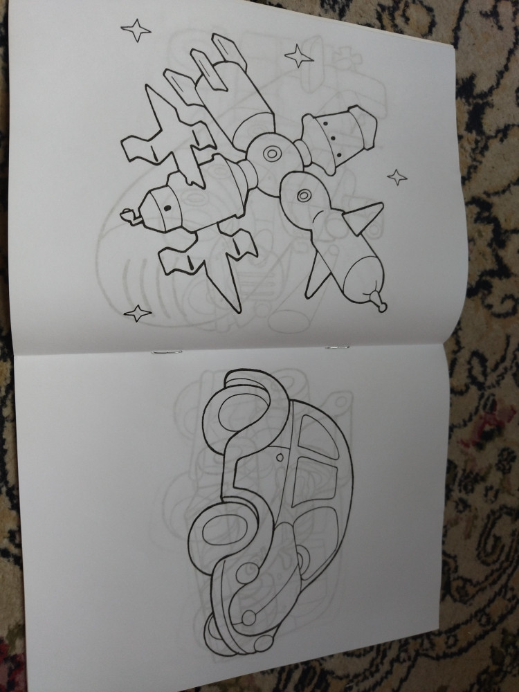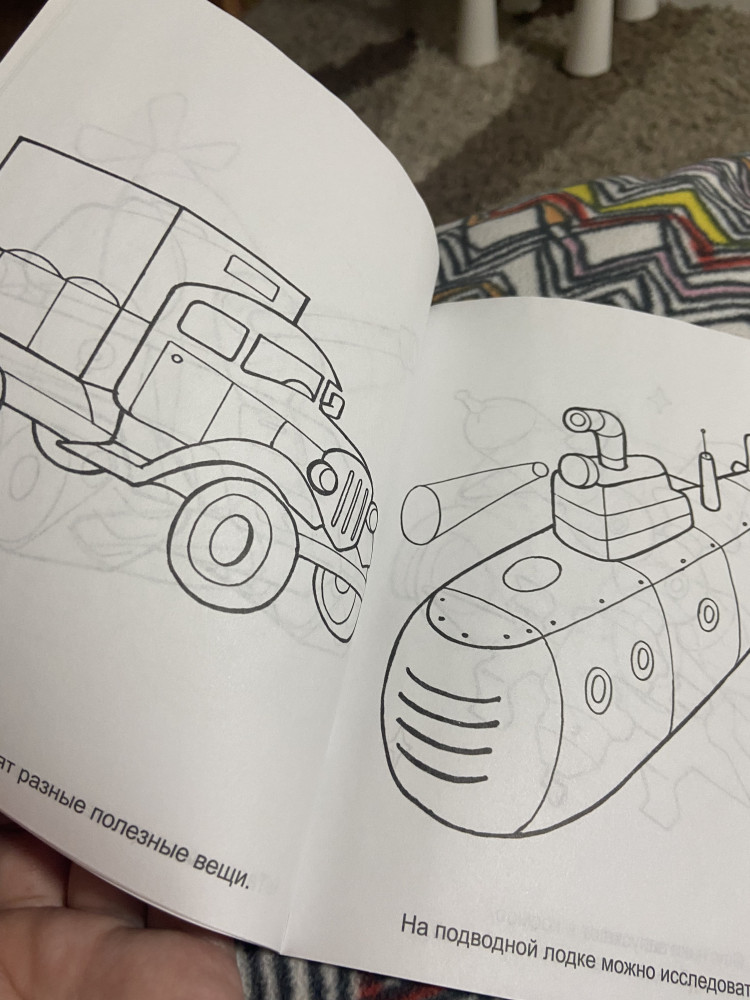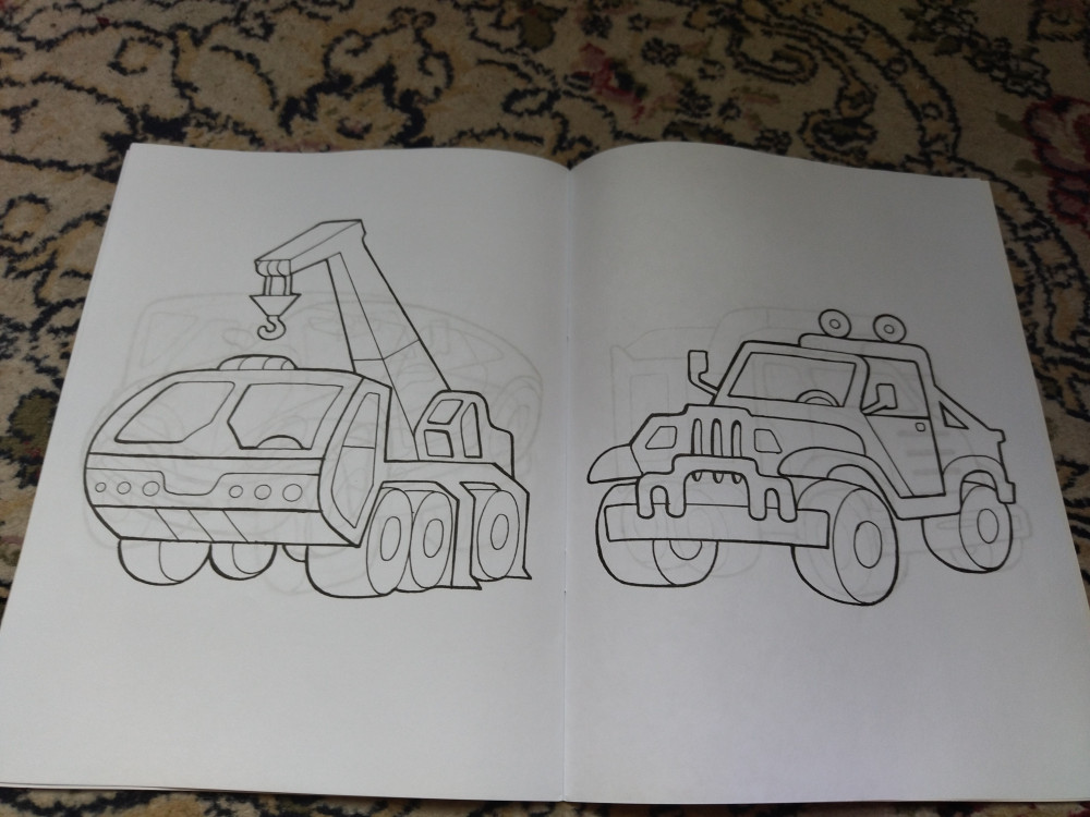 Четкие толстые контуры, на одной странице одна машинка крупного размера, есть и самолетики