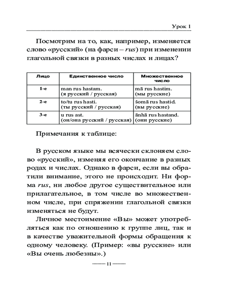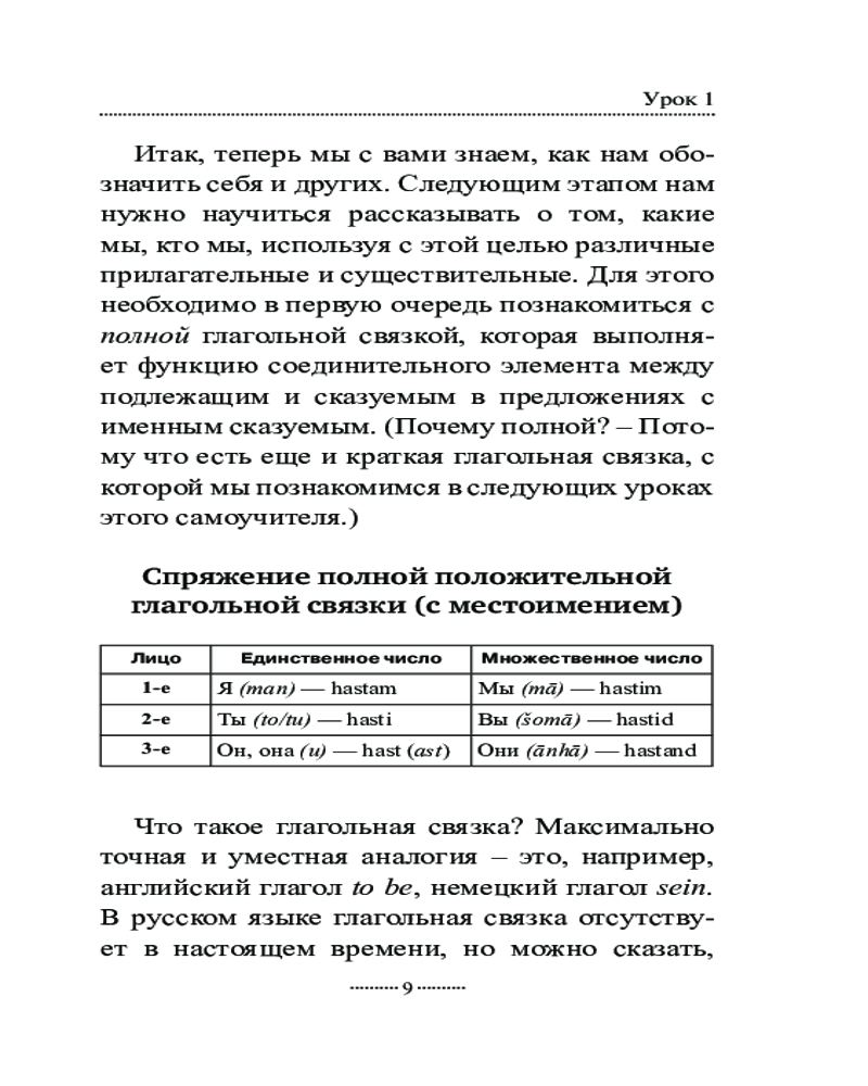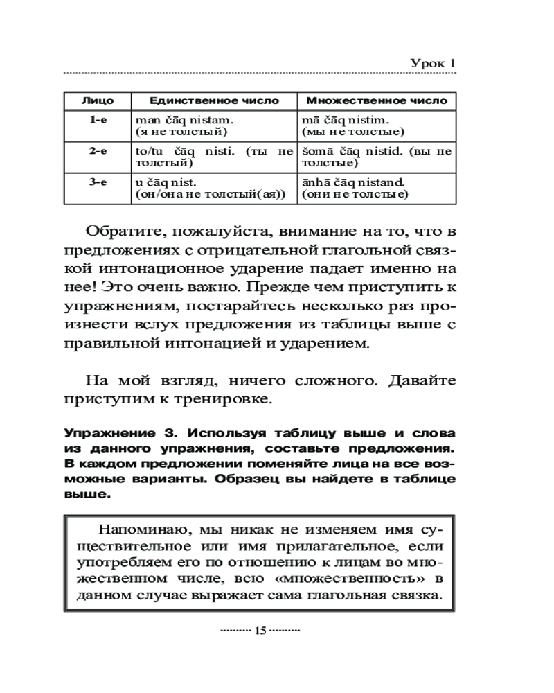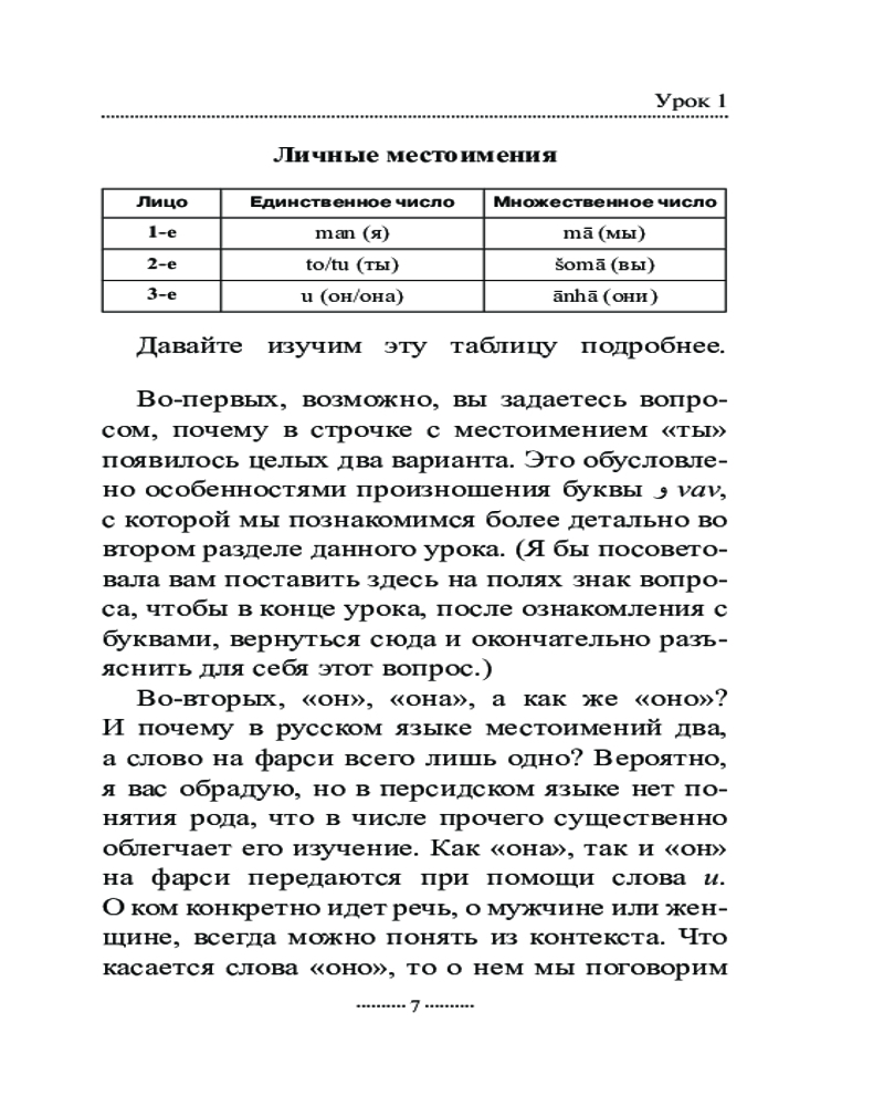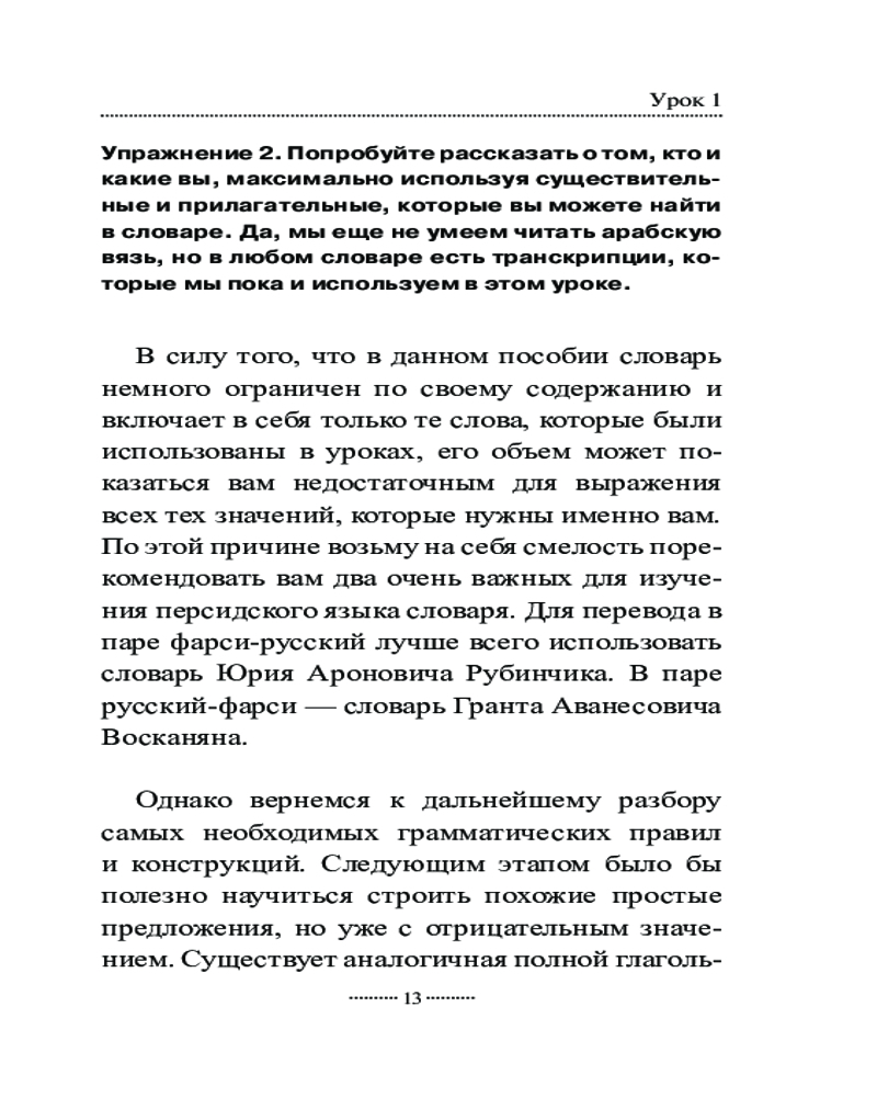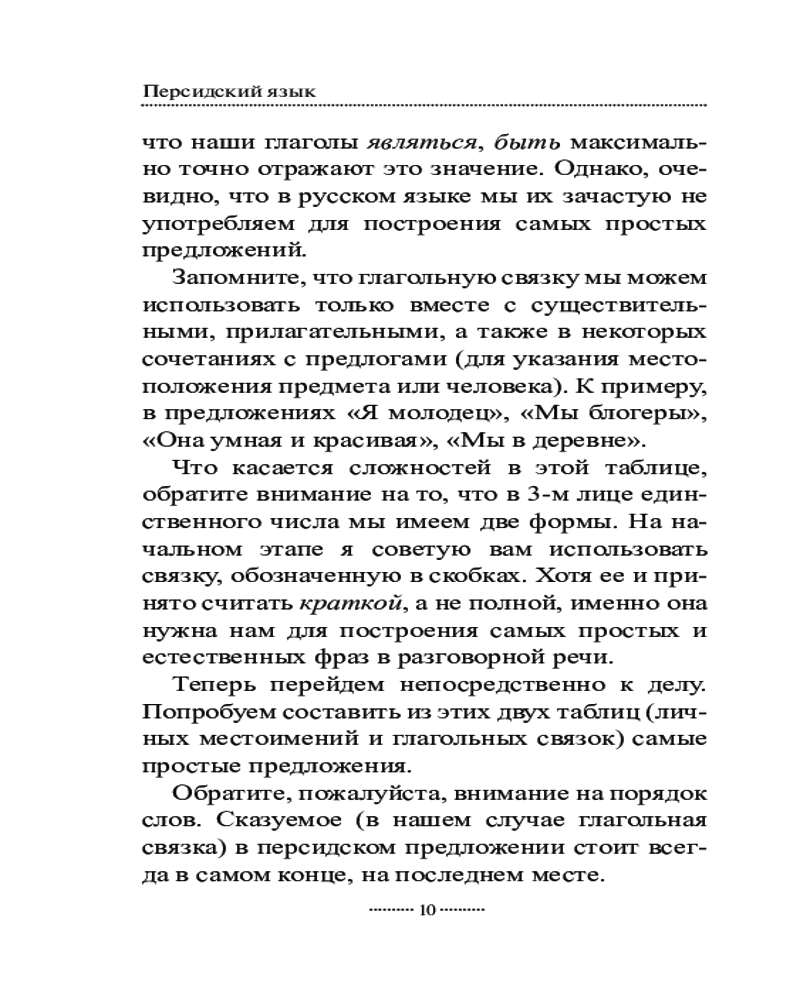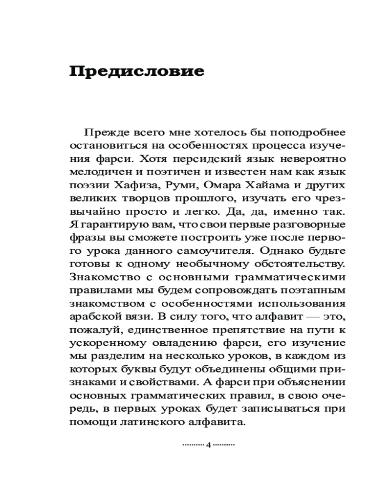 Самоучитель состоит из 18 уроков, за которые вы овладеете чтением и письмом на персидском языке, познакомитесь с временами, основными видами глаголов, особенностями местоимений, существительных, прилагательных и числительных, запомните некоторые предлоги и союзы, узнаете о такой важной конструкции, как изафет, и научитесь строить простые предложения, полезные в обиходе.