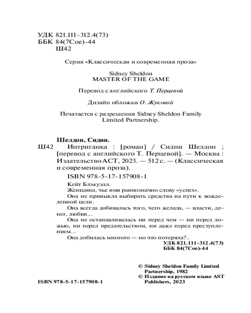 💳 Оплатить за товар можно при получении 🇰🇿 Есть бесплатная доставка по Казахстану от 1 дня 🎁 Копите бонусы с каждой покупки Серия: Классическая и современная проза (нов) Кейт Блэкуэлл. Женщина, чье имя равнозначно слову «успех». Она не привыкла выбирать средства на пути к вожделенной цели. Она всегда добивалась того, чего желала, — власти, денег, любви... Она не останавливалась ни перед чем — ни перед ложью, ни перед предательством, ни даже перед преступлением... Она добилась многого — но что потеряла?.. |