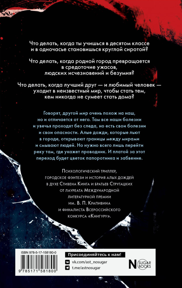 💳 Оплатить за товар можно при получении 🇰🇿 Есть бесплатная доставка по Казахстану от 1 дня 🎁 Копите бонусы с каждой покупки Серия: NoSugar. Тьма Есть любимый человек, который решил бороться с болезнью любой ценой. Есть красный дождь, который льет, не переставая. Есть другой мир, в котором наши болезни исчезают. Есть проводник в тот мир — строптивый, но лучший. И нет времени выяснять, откуда этот проводник взялся, какова расплата за исцеление и что делать, если возврата в свой мир не будет. |