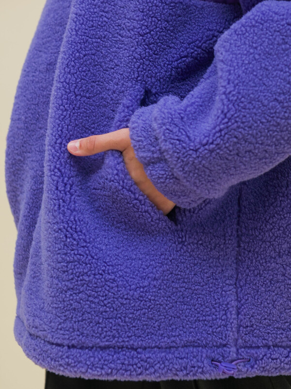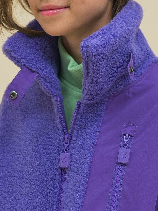 Толстовка детская для девочки. Куртка выполнена в сочетании двух материалов: бербер-флиса с мягкой фактурой «барашка» и гладкой курточной ткани. Это один из наиболее актуальных трендов сезона. Плюшевая толстовка модного оверсайз-силуэта со спущенным плечом не будет стеснять движений ребёнка, подарит ощущение комфорта и уюта. По переду застёжка на центральную молнию. Толстовка дополнена отложным воротником, который можно трансформировать с воротник-стойку с застёжкой на пату из курточной ткани с кнопкой — шея ребёнка защищена от холода и ветра. Куртка дополнена удобными прорезными карманами по бокам.