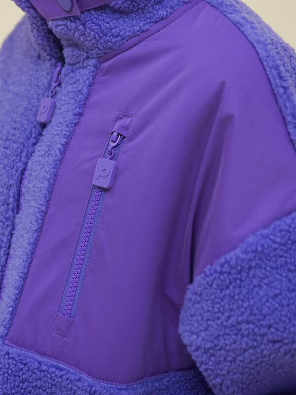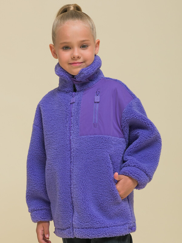 Толстовка детская для девочки. Куртка выполнена в сочетании двух материалов: бербер-флиса с мягкой фактурой «барашка» и гладкой курточной ткани. Это один из наиболее актуальных трендов сезона. Плюшевая толстовка модного оверсайз-силуэта со спущенным плечом не будет стеснять движений ребёнка, подарит ощущение комфорта и уюта. По переду застёжка на центральную молнию. Толстовка дополнена отложным воротником, который можно трансформировать с воротник-стойку с застёжкой на пату из курточной ткани с кнопкой — шея ребёнка защищена от холода и ветра. Куртка дополнена удобными прорезными карманами по бокам.
