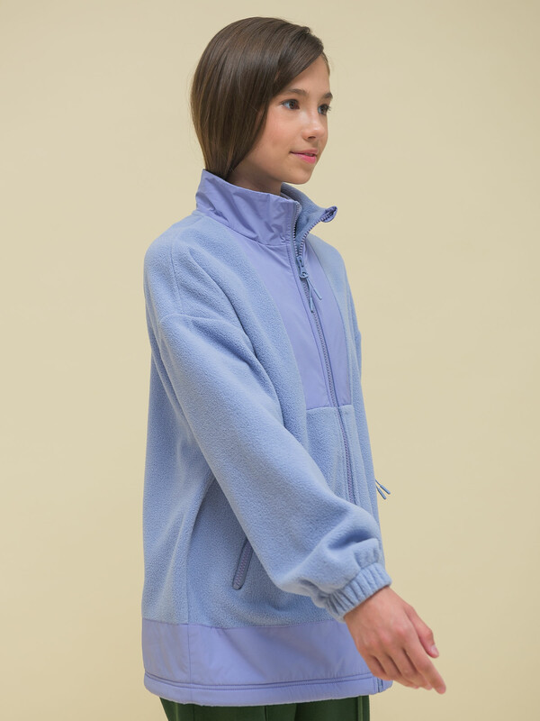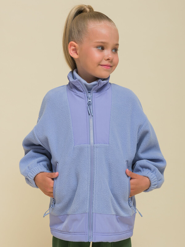 Толстовка детская для девочки. Куртка модного оверсайз-силуэта со спущенным плечом подарит ребёнку комфорт и свободу движения. Классическая застёжка на центральную молнию спереди, вверху молнии ограничитель для безопаного застёгивания. Толстовка на замке выполнена из флиса. Воротник и вставки по горловине и низу изделия — из гладкой курточной ткани. Стильно и практично. Сочетание материалов разных фактур — модный тренд сезона. А детали из курточной ткани менее маркие при частых прикосновениях к ним. По низу изделия предусмотрена регулировка объёма эластичным шнуром со стопперами.