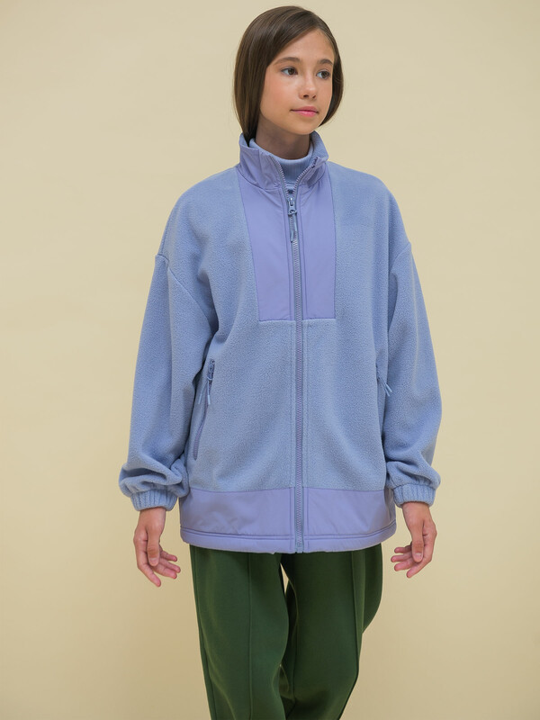 Толстовка детская для девочки. Куртка модного оверсайз-силуэта со спущенным плечом подарит ребёнку комфорт и свободу движения. Классическая застёжка на центральную молнию спереди, вверху молнии ограничитель для безопаного застёгивания. Толстовка на замке выполнена из флиса. Воротник и вставки по горловине и низу изделия — из гладкой курточной ткани. Стильно и практично. Сочетание материалов разных фактур — модный тренд сезона. А детали из курточной ткани менее маркие при частых прикосновениях к ним. По низу изделия предусмотрена регулировка объёма эластичным шнуром со стопперами.