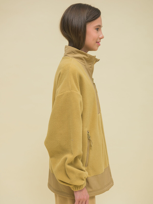 Толстовка детская для девочки. Куртка модного оверсайз-силуэта со спущенным плечом подарит ребёнку комфорт и свободу движения. Классическая застёжка на центральную молнию спереди, вверху молнии ограничитель для безопаного застёгивания. Толстовка на замке выполнена из флиса. Воротник и вставки по горловине и низу изделия — из гладкой курточной ткани. Стильно и практично. Сочетание материалов разных фактур — модный тренд сезона. А детали из курточной ткани менее маркие при частых прикосновениях к ним. По низу изделия предусмотрена регулировка объёма эластичным шнуром со стопперами.