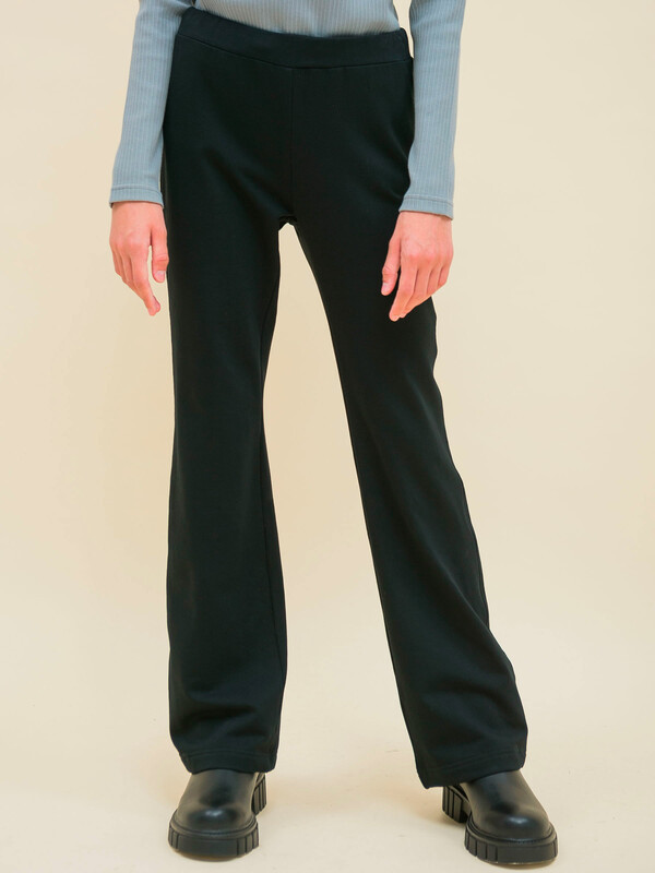 Брюки клёш для девочки из футера с начесом. Трендовые брюки-буткат подарят ребёнку свободу движений и ощущение комфорта и уюта. Одна из наиболее актуальных моделей сезона — штаны, плотно прилегающие на бёдрах и расклешённые от колена. Широкая резинка в поясе не давит и не перекручивается. С помощью шнурка со стоппером в поясе можно регулировать объём и посадку брюк. Изделие однотонное, без принта. За брюками легко ухаживать. В составе ткани (эластичный трикотаж) преобладает высококачественный хлопок — штаны тёплые, мягкие и прекрасно пропускают воздух — кожа ребёнка дышит. Благодаря эластану изделие хорошо тянется и при этом сохраняет отличную форму в течение длительного времени. Замечательные брюки на девочек дошкольного и младшего школьного возраста, а также девочек-подростков. Брюки клёш чёрные идеальны для детского сада, школы, прогулок, отдыха, а также для дома. Подходят для круглогодичной носки: в прохладную погоду летом, осенью, зимой, весной и демисезон.