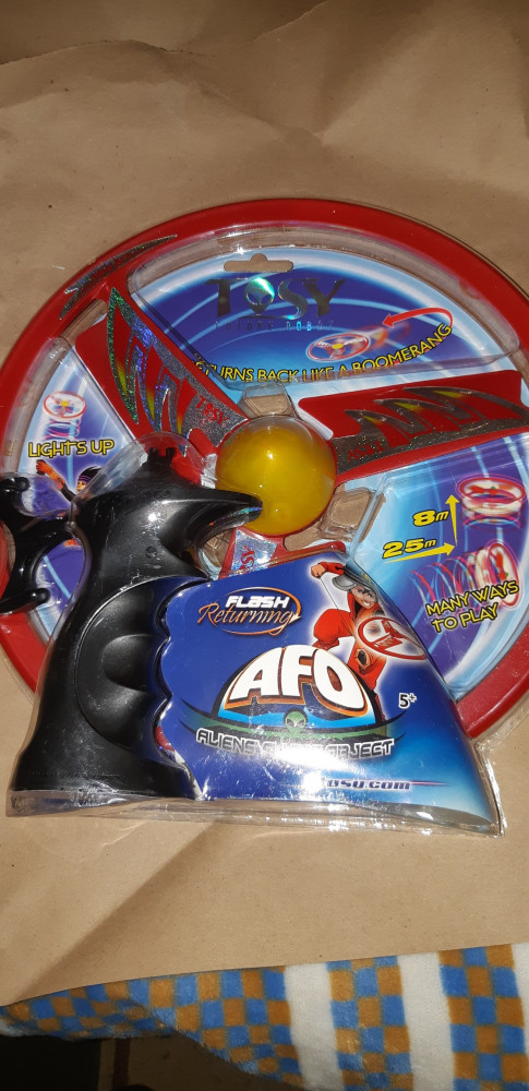 TOSY Бумеранг последнего поколенияВ данный момент этот товар отсутствует в продаже. Возможно, у нас найдется аналогичный или похожий товар здесь. AFO-диск — возвращается по принципу бумеранга. Имеет 6 вариантов запуска, со светом. Это бумеранг последнего поколения, разработанный вьетнамской компанией, которая специализируется на игрушках класса хай-тек. В отличии от подобных «китайских» аналогов возвращается на место своего запуска. В него можно играть как дома, так и на улице. Высокое качество используемого пластика позволяет запускать бумеранг до 10 000 раз. AFO-диск — инопланетный летающий диск, самый современный бумеранг. |