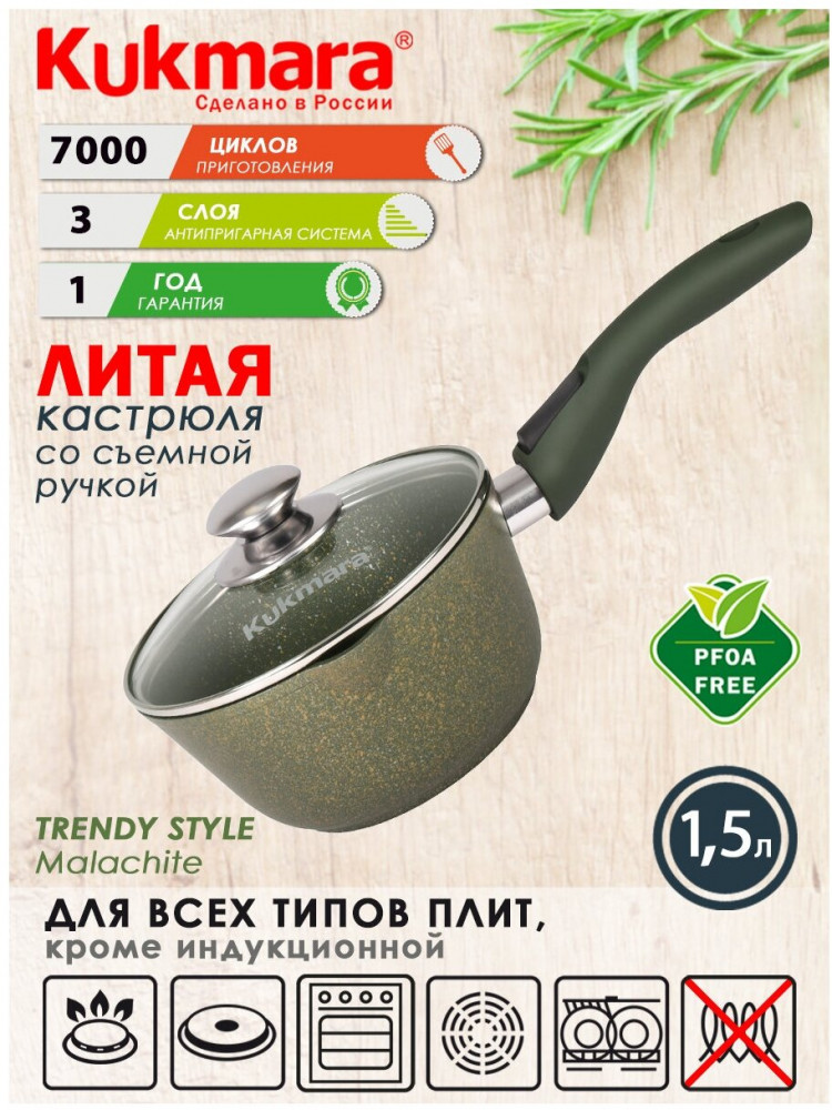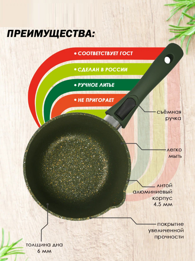 Не пригорает, толстое дно, ручка съёмная, удобно хранить, можно запекать в духовке
