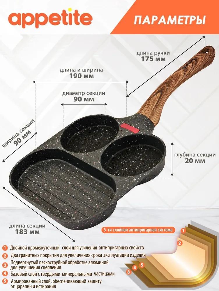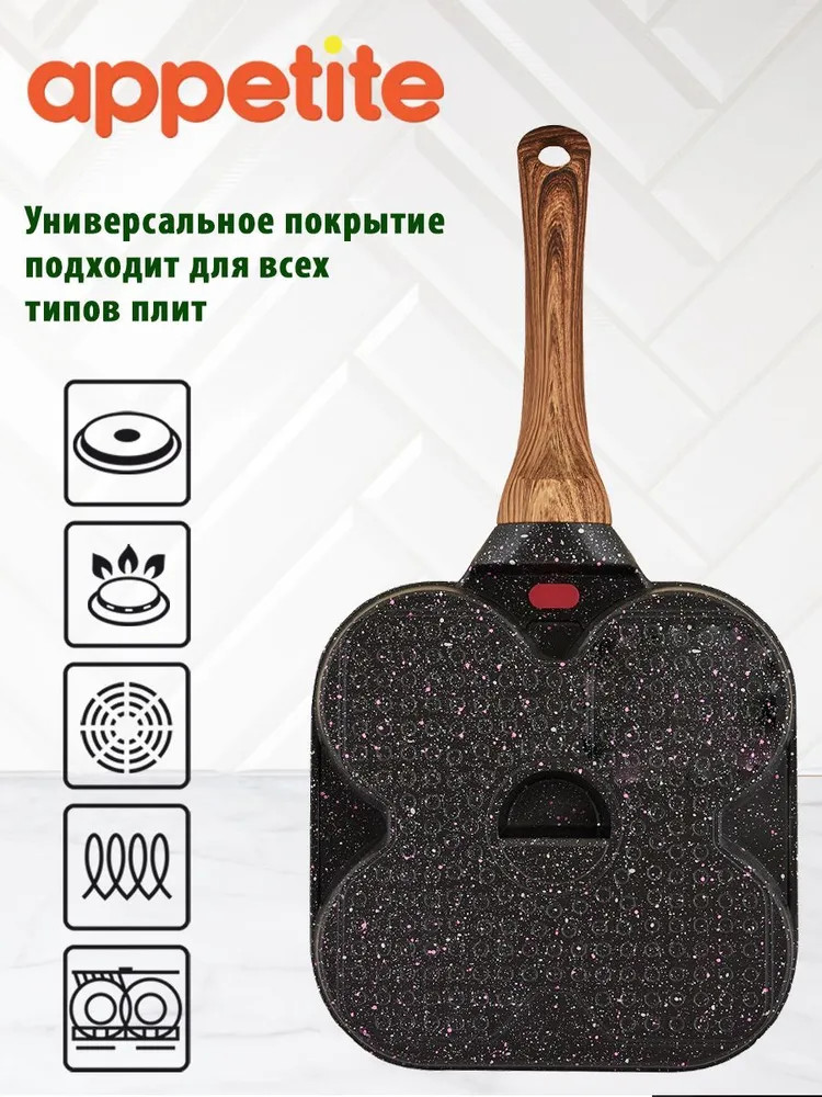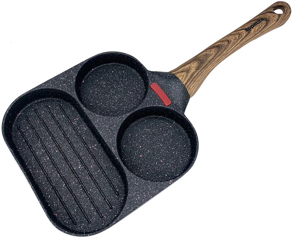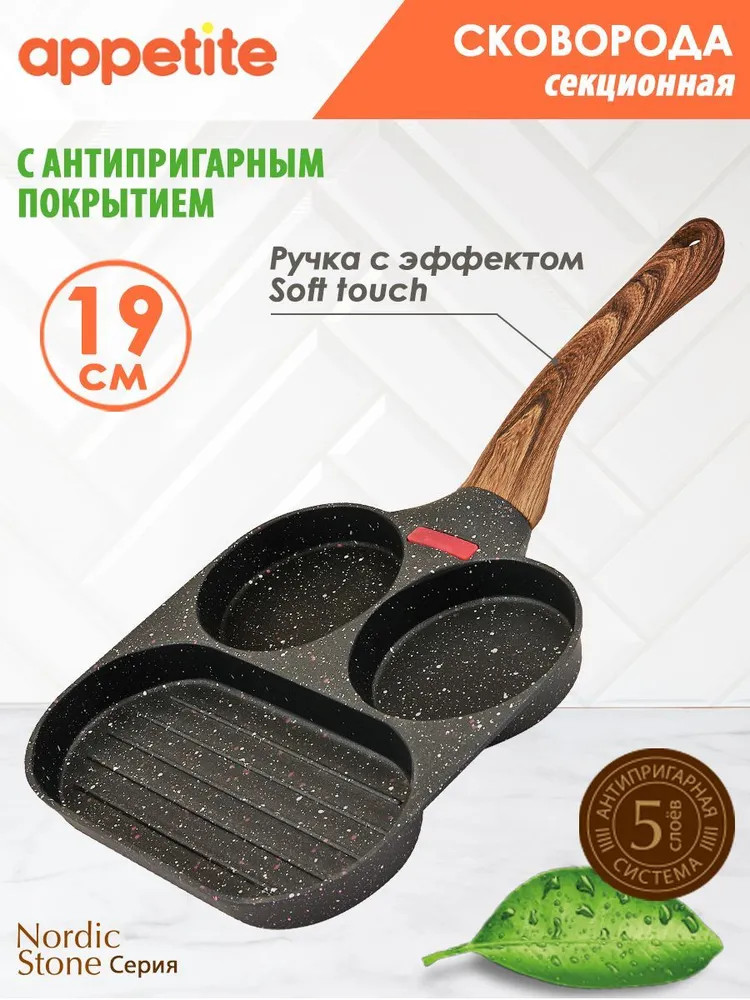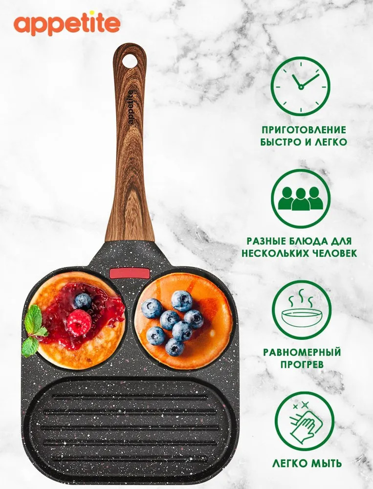Appetite Сковорода для завтраковВ данный момент этот товар отсутствует в продаже. Возможно, у нас найдется аналогичный или похожий товар здесь. Сковороды серии Nordic Stone изготовлены из качественных материалов с нанесением современного многослойного покрытия. Изделия отличается актуальным и эффектным дизайном: покрытие напоминает структуру мрамора. Приятным дополнением к сковороде стала эргономичная ручка из термостойкого пластика с «бархатным» эффектом Soft Touch под дерево. Ручка удобно лежит в руке, не выскальзывая. |