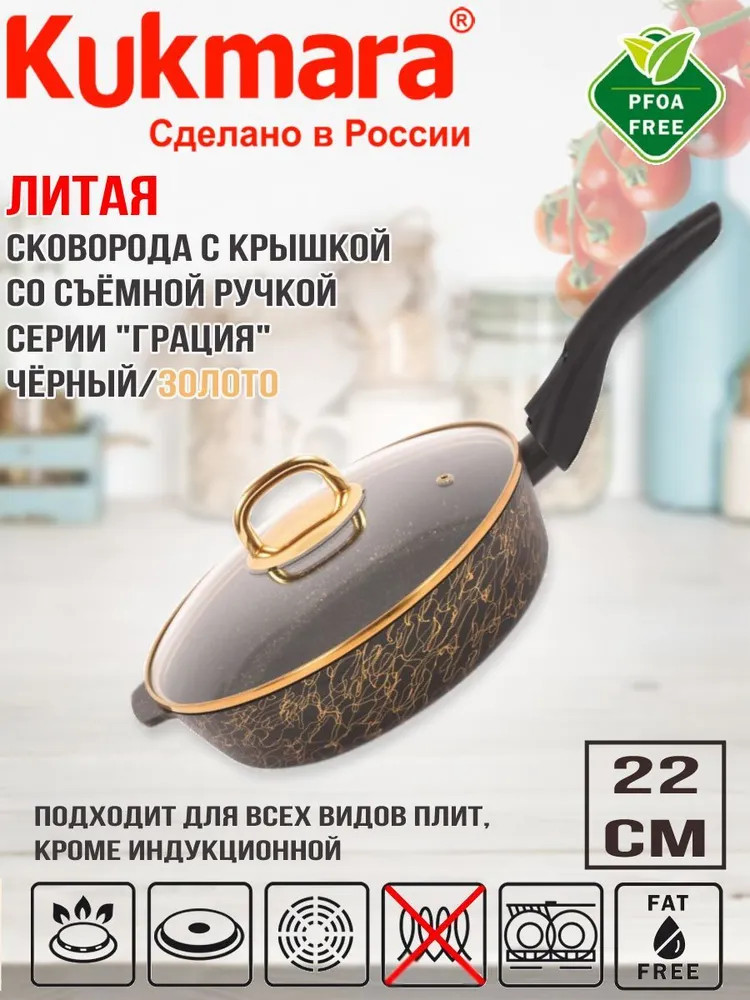 Глубокая форма и толстое дно сковороды линии «Грация» обеспечивают быстрое и равномерное распределение тепла, что позволяет приготовить еду за считанные минуты. Высокие и прямые стенки дают возможность переворачивать овощи, мясо, рыбу не рассыпав содержимое сковороды на плиту. Внутреннее противопригорающее покрытие, украшенное красивейшими вкраплениями золотого цвета, разработано по индивидуальному заказу ТМ Kukmara, не содержит PFOA, кадмий, свинец и полностью безопасно. Высокая прочность антипригарного покрытия позволяет использовать неострые кухонные металлические принадлежности. Сковорода имеет ровное, проточенное дно, которое обеспечивает максимальное прилегание дна сковороды к плите для более быстрого и равномерного нагрева.