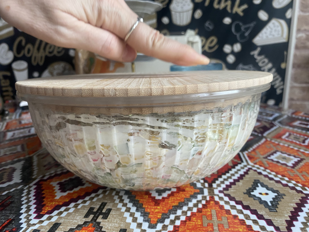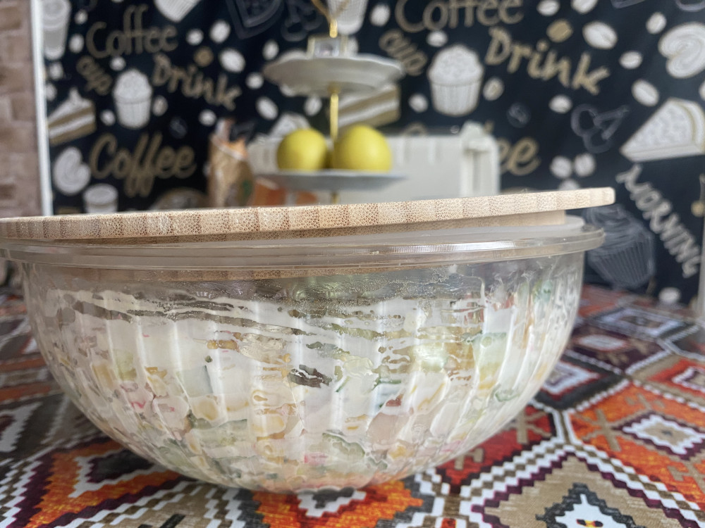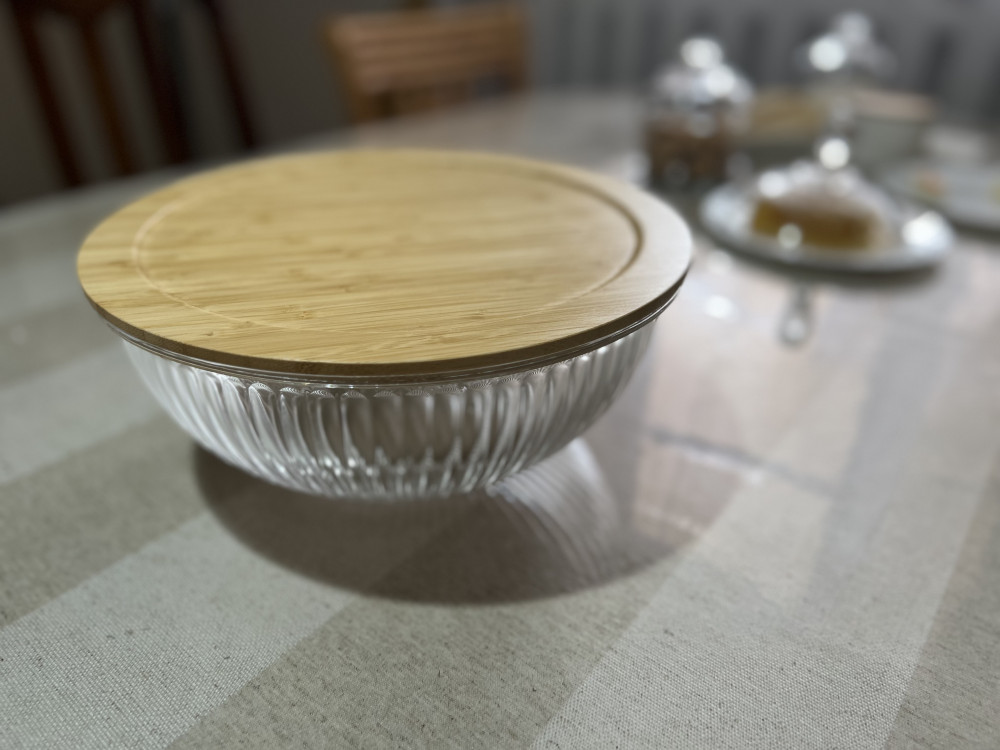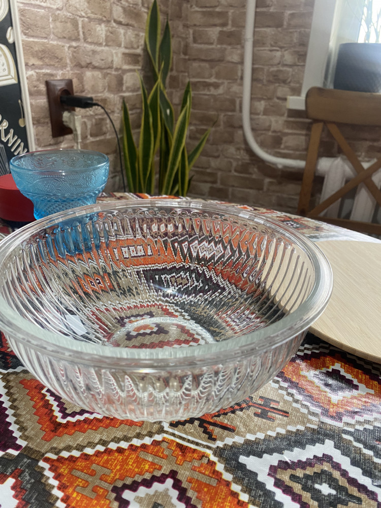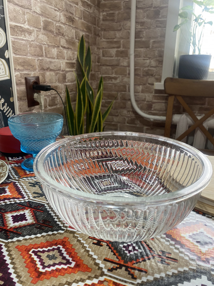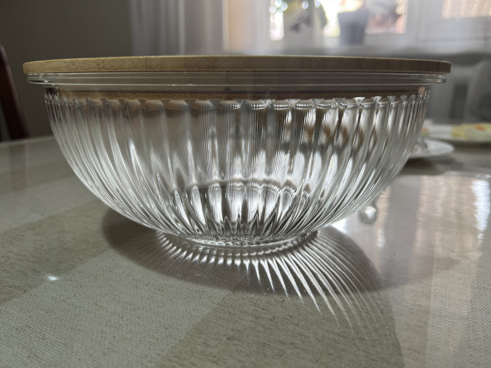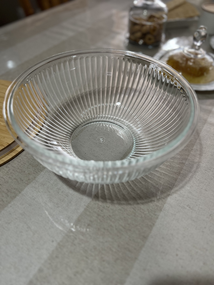 Чашка очень понравилась . Эстетика на кухне поднимает настроение . Теперь салат в большом количестве можно готовить в такой красивой чашке и главное хранить удобно и красиво . Стекло толстое , обнадеживает . Нравится , что в отличии от эмалированной не будет сколов , в отличии от пластиковой не будет царапин , вариант только один -разбить 😁но такую красивую чашу хочется беречь . Надеюсь прослужит долго ☺️