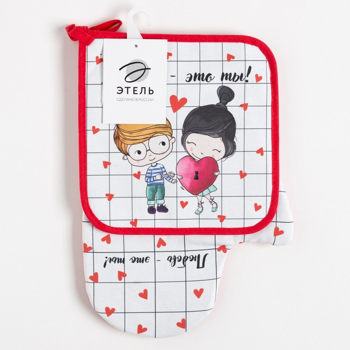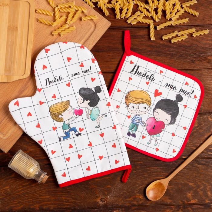 Нарядный кухонный набор — отличный подарок для хорошей хозяйки. В комплект входят прихватка и рукавица, которые защитят от ожогов, если нужно приготовить картошку-фри на кипящем масле, слить горячую воду из-под вареных овощей, достать раскаленные горшочки из духового шкафа.
