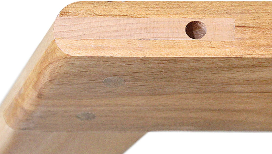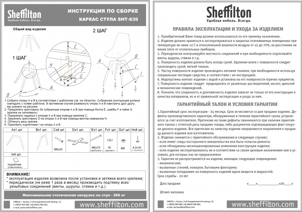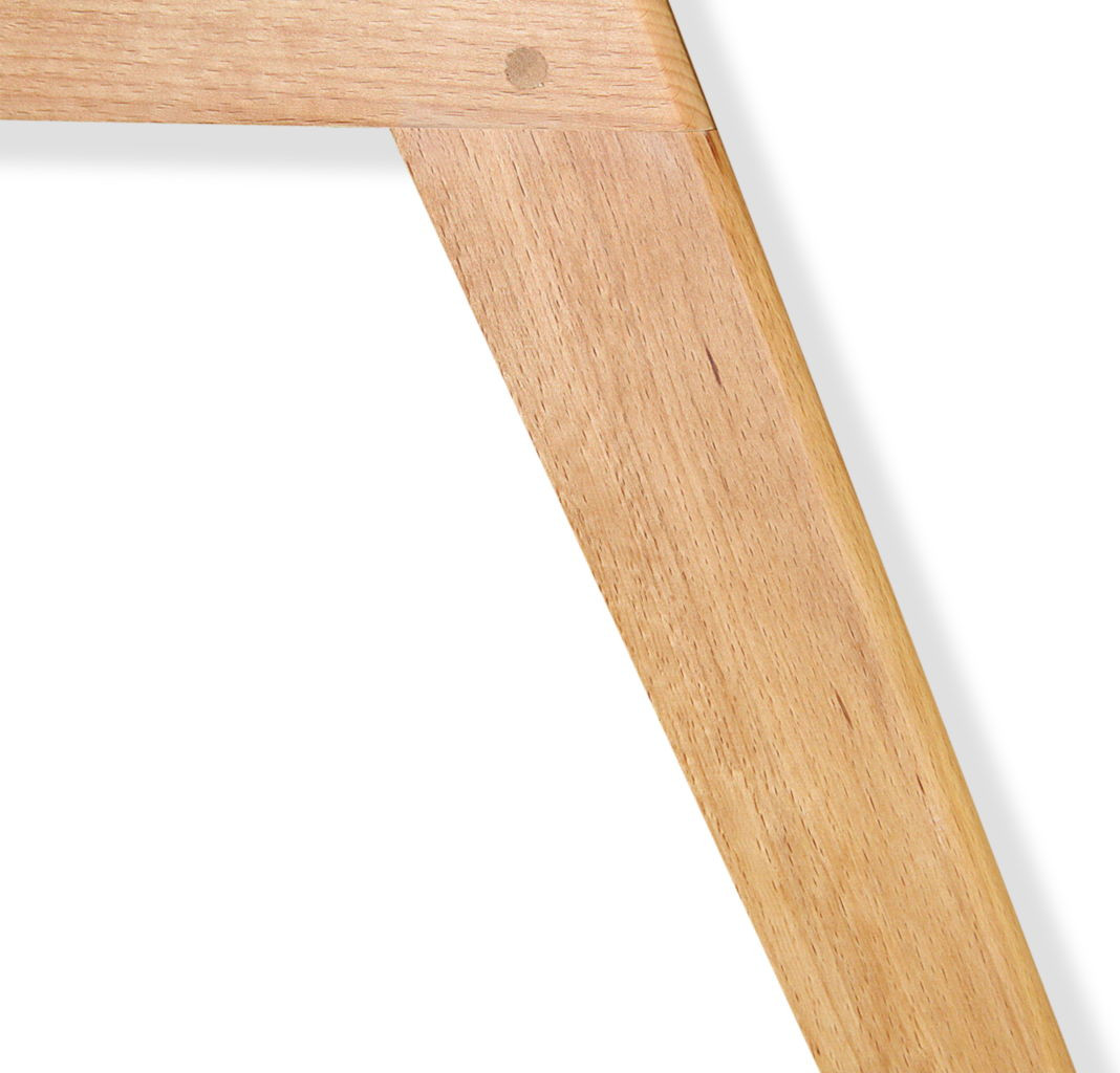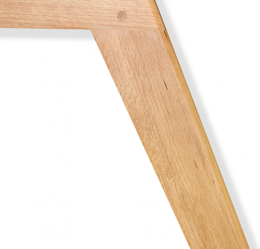 Каркас выполнен из массива древесины с последующим тонированием и покрытием лаком. В модели предусмотрена металлическая крестовина, которая придает жесткость конструкции и продлевает срок службы, толщина крестовины 1,5 мм, крепится с помощью саморезов и мебельного болта с нижней стороны каркаса. Максимальная статическая нагрузка на стул — 260 кг. Изогнутая спинка сидения обеспечивает удобную посадку и комфортное времяпровождение. Специальные подпятники каркаса обеспечивают защиту покрытия от царапин и повышают устойчивость стула. К каркасу приложен комплект крепежа и схема сборки.