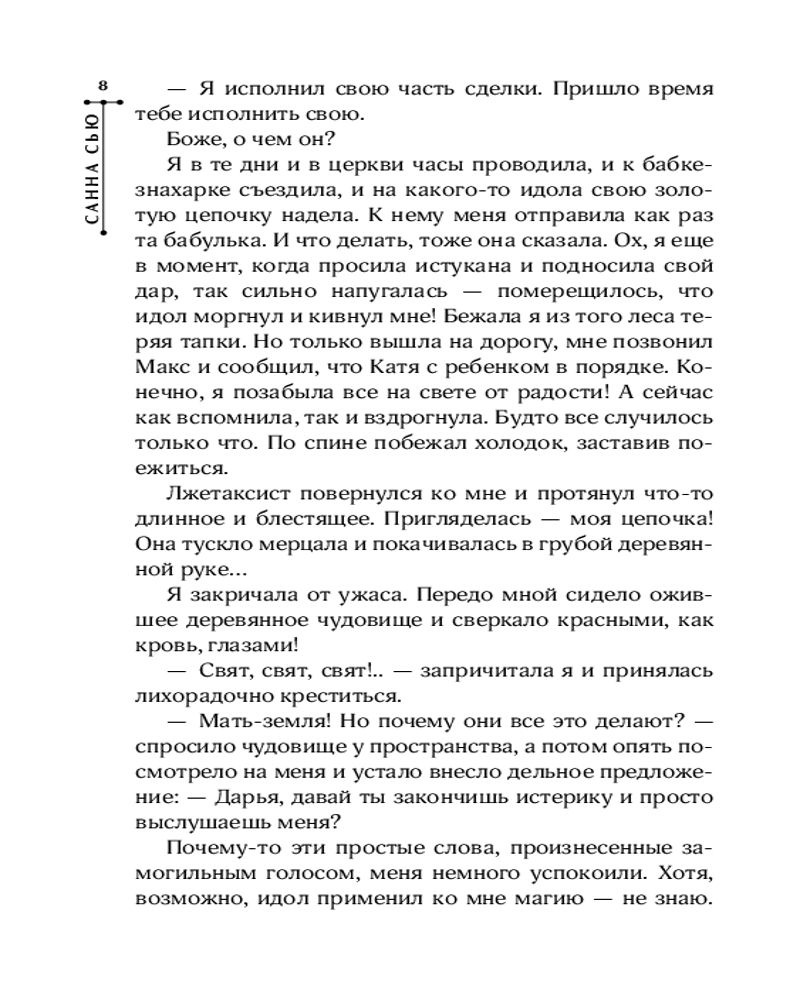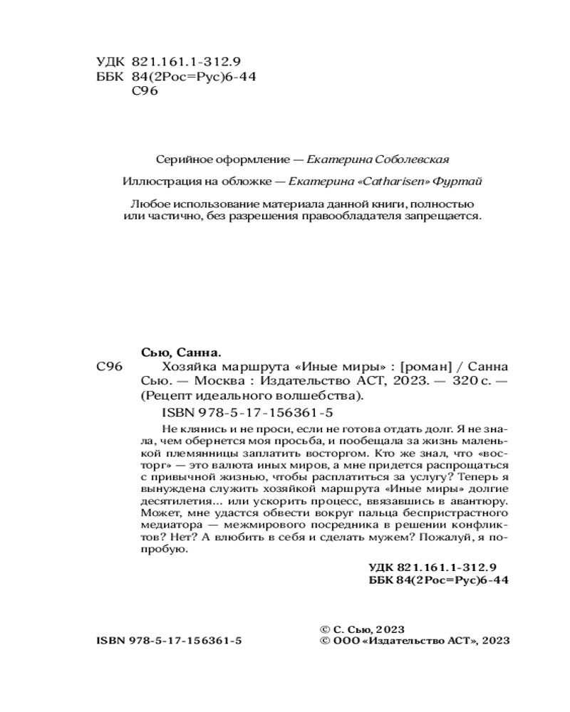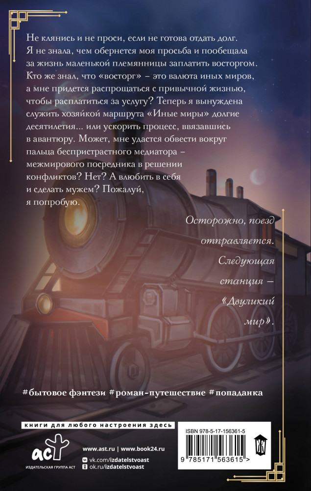 💳 Оплатить за товар можно при получении 🇰🇿 Есть бесплатная доставка по Казахстану от 1 дня 🎁 Копите бонусы с каждой покупки Серия: Рецепт идеального волшебства Не клянись и не проси, если не готова отдать долг. Я не знала, чем обернется моя просьба и пообещала за жизнь маленькой племянницы заплатить восторгом. Кто же знал, что «восторг» — это валюта иных миров, а мне придется распрощаться с привычной жизнью, чтобы расплатиться за услугу? Теперь я вынуждена служить хозяйкой маршрута «Иные миры» долгие десятилетия... или ускорить процесс, ввязавшись в авантюру. Может, мне удастся обвести вокруг пальца беспристрастного медиатора — межмирового посредника в решении конфликтов? Нет? А влюбить в себя и сделать мужем? Пожалуй, я попробую. |