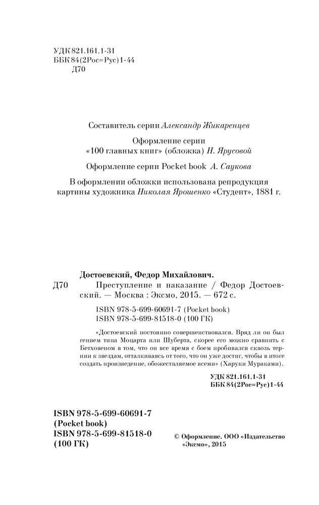 💳 Оплатить за товар можно при получении 🇰🇿 Есть бесплатная доставка по Казахстану 🎁 Копите бонусы с каждой покупки Серия: Pocket Book (обложка) Достоевский постоянно совершенствовался. Вряд ли он был гением типа Моцарта или Шуберта, скорее его можно сравнить с Бетховеном в том, что он все время с боем пробивался сквозь тернии к звездам, отталкиваясь от того, что он уже достиг, чтобы в итоге создать произведение, обожествляемое всеми (Харуки Мураками). |