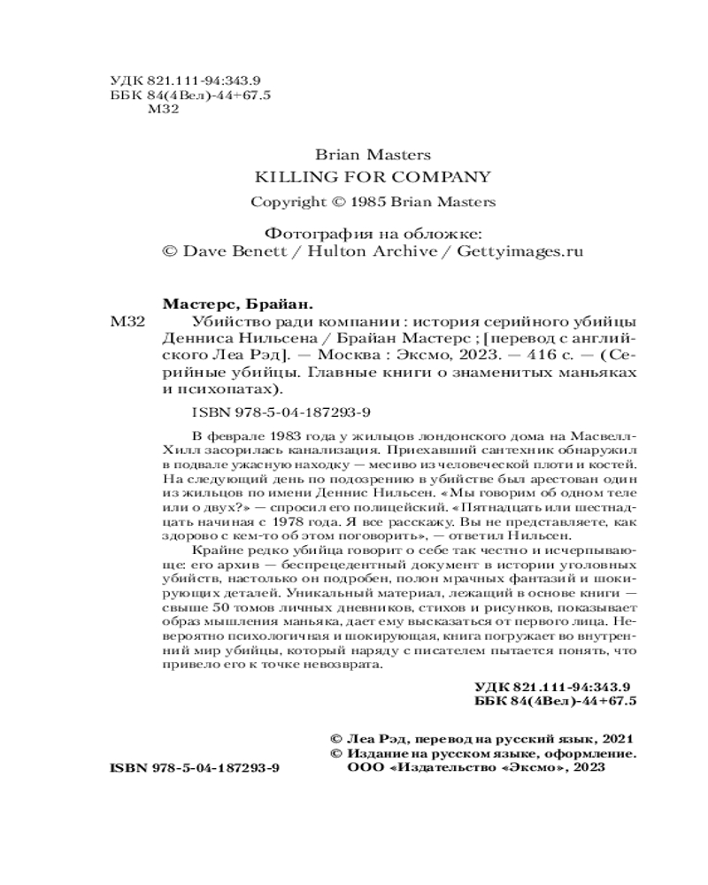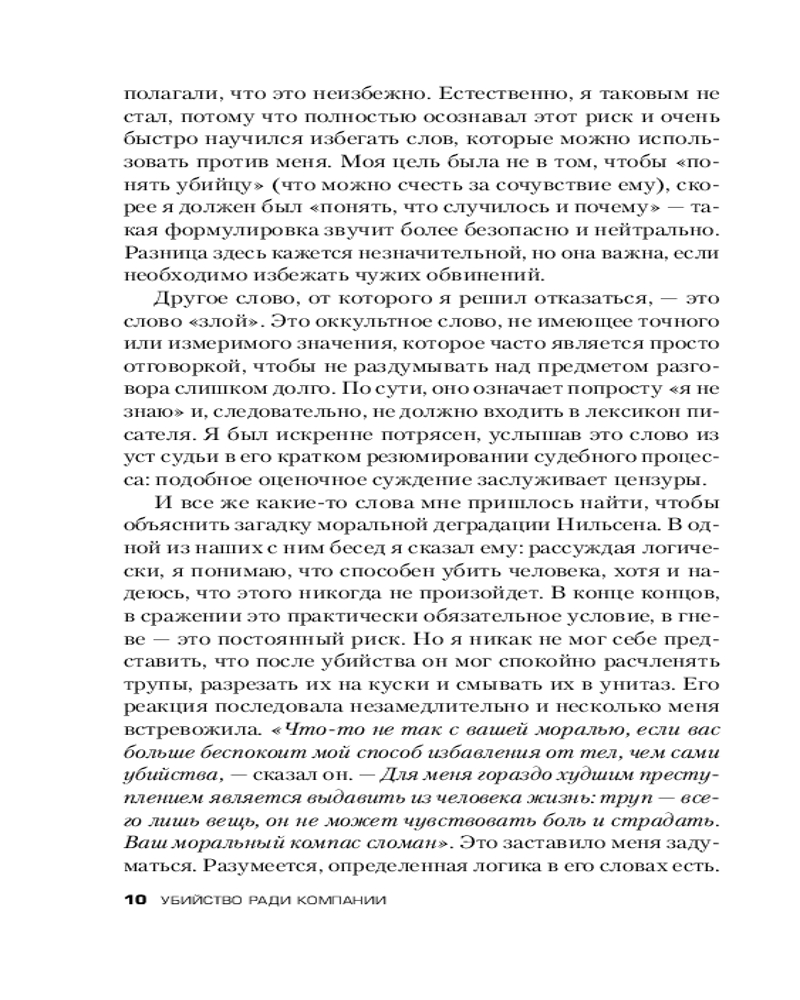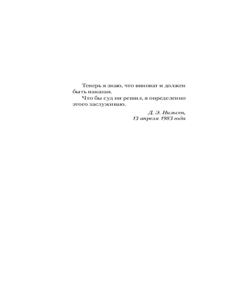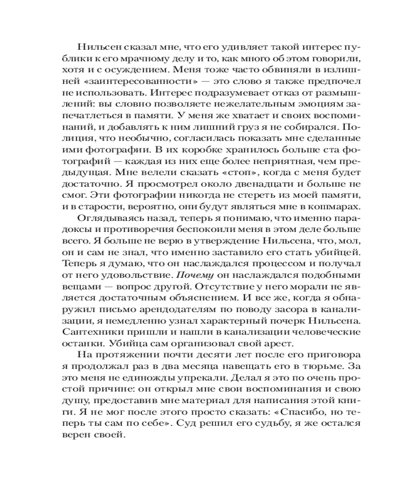 Это новаторское криминальное исследование психологии маньяка, написанное при полном сотрудничестве самого Нильсена. В результате получился захватывающий — и ужасающий — портрет человека, влюбленного в смерть.