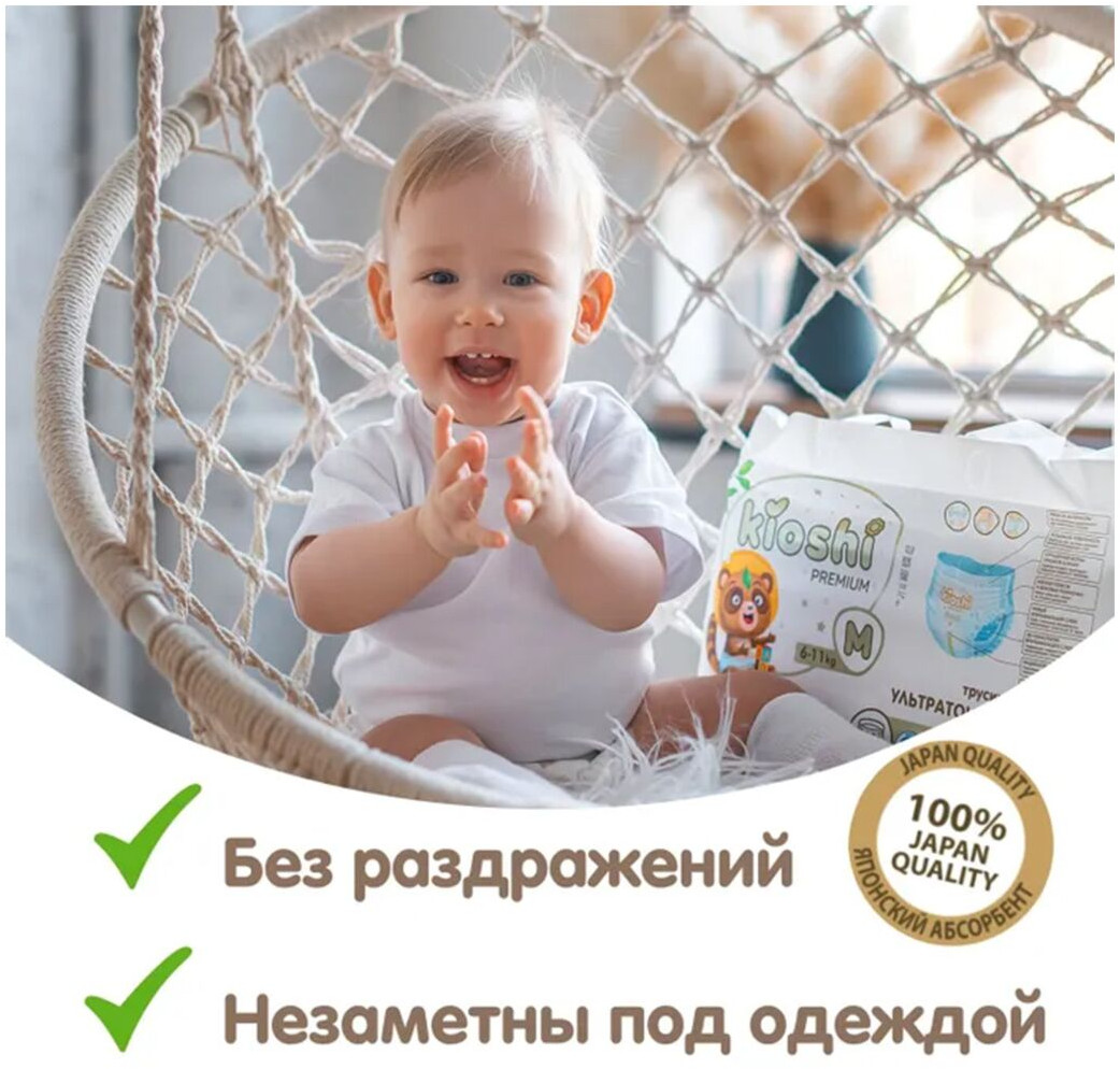 Подгузник хорошо держит влагу, не протекает Мягкий, приятный на ощупь Широкая резинка, не тугая Есть индикатор наполнения и утилизационная лента