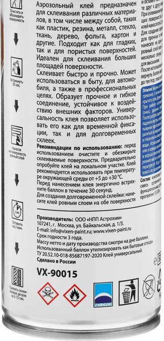 Vixen Клей универсальныйВ данный момент этот товар отсутствует в продаже. Возможно, у нас найдется аналогичный или похожий товар здесь. Аэрозольный клей предназначен для склеивания различных материалов, в том числе между собой, таких как пластик, резина, металл, стекло, ткань, дерево, фольга, картон и другие. Подходит как для гладких, так и для пористых поверхностей. Идеален для склеивания больших площадей поверхности. Склеивает быстро и прочно. Может использоваться в быту, для автомобиля, а также в профессиональных целях. Образует прочное и гибкое соединение, устойчивое к воздействию внешних факторов. Универсальность клея позволяет использовать его как для временной фиксации, так и для долговременных склеек. |
