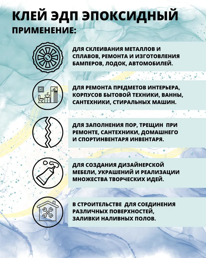Способ применения: в быту для ремонта предметов интерьера, корпусов бытовой техники и акустических систем, ванны, сантехники, баков стиральных машин. Клей ЭДП универсальный отлично подойдет для ремонта спортинвентаря, также применяется для ремонта и изготовления стеклопластиковых поверхностей, ремонта и изготовления бамперов, корпусов лодок, автомобилей, моделирования, производства наливных полов.