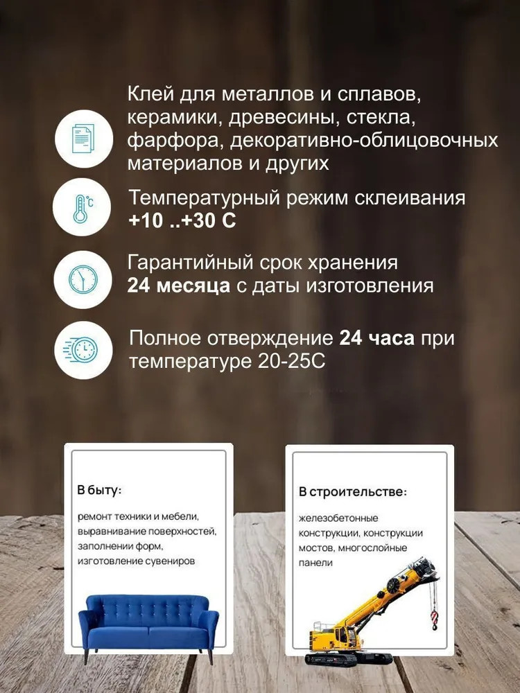 Клей эпоксидный универсальный марки ЭДП — предназначен для склеивания металлов и их сплавов, древесины, керамики, фарфора, стекла, — декоративно-облицовочных и других материалов, — а также для заделки пор, трещин, раковин при ремонте домашнего инвентаря или автомобилей.