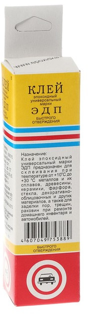 Клей эпоксидный универсальный марки ЭДП — предназначен для склеивания металлов и их сплавов, древесины, керамики, фарфора, стекла, — декоративно-облицовочных и других материалов, — а также для заделки пор, трещин, раковин при ремонте домашнего инвентаря или автомобилей.