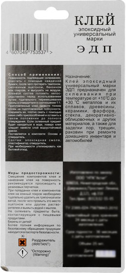 Универсальный эпоксидный клей для различного вида ремонтных работ в бытовых условиях. Предназначен для склеивания при температуре от +10 0С до +30 0С металлов и их сплавов, древесины, керамики, фарфора, стекла, декоративно-облицовочных и других материалов, а также для заделки пор, трещин, раковин при ремонте домашнего инвентаря и автомобилей.