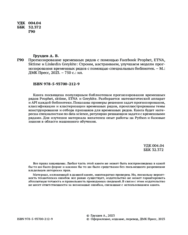 💳 Оплатить за товар можно при получении 🇰🇿 Есть бесплатная доставка по Казахстану от 1 дня 🎁 Копите бонусы с каждой покупки Прогнозирование — одна из задач науки о данных, которая является центральной для многих видов деятельности внутри организации. Книга посвящена популярным библиотекам прогнозирования временных рядов Prophet, sktime, ETNA и Greykite. Разбирается математический аппарат и API каждой библиотеки. Показаны примеры решения задач прогнозирования, классификации и кластеризации временных рядов, проиллюстрированы темы конструирования и отбора признаков для временных рядов. В качестве примеров прогнозирования используются данные из самых разных областей — уровень углекислого газа в атмосфере, циклы солнечных пятен, количество местных осадков, число лайков в популярных соцсетях и др. |