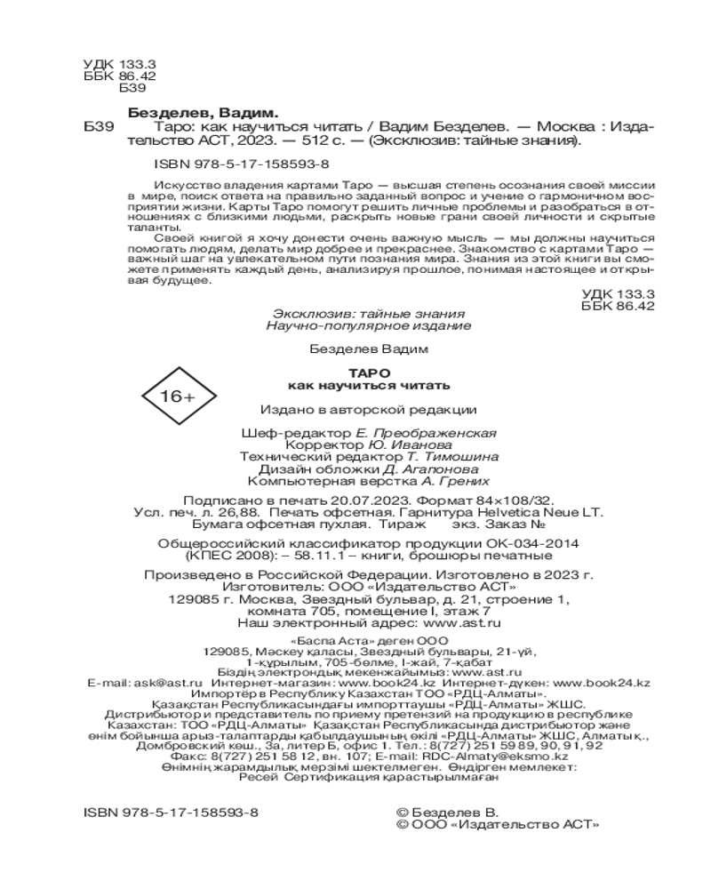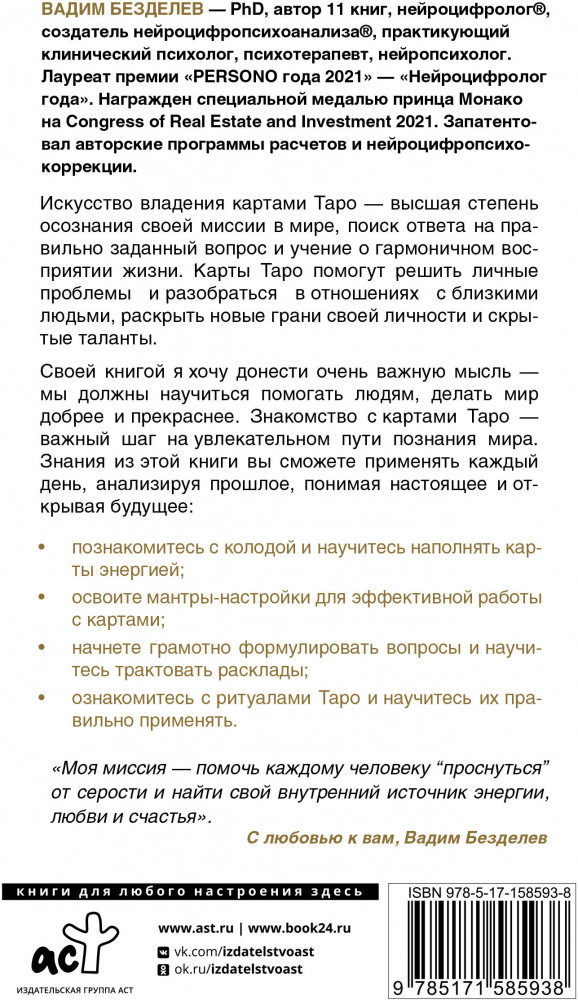 💳 Оплатить за товар можно при получении 🇰🇿 Есть бесплатная доставка по Казахстану от 1 дня 🎁 Копите бонусы с каждой покупки Серия: Эксклюзив: тайные знания Вадим Безделев — PhD, автор 11 книг, нейроцифролог®, создатель нейроцифропсихоанализа®, практикующий клинический психолог, психотерапевт, нейропсихолог. Лауреат премии «PERSONO года 2021» — «Нейроцифролог года». Награжден специальной медалью принца Монако на Congress of Real Estate and Investment 2021. Запатентовал авторские программы расчетов и нейроцифропсихокоррекции. |