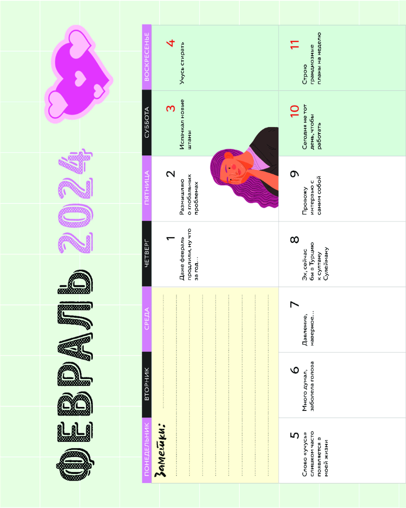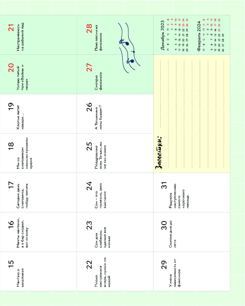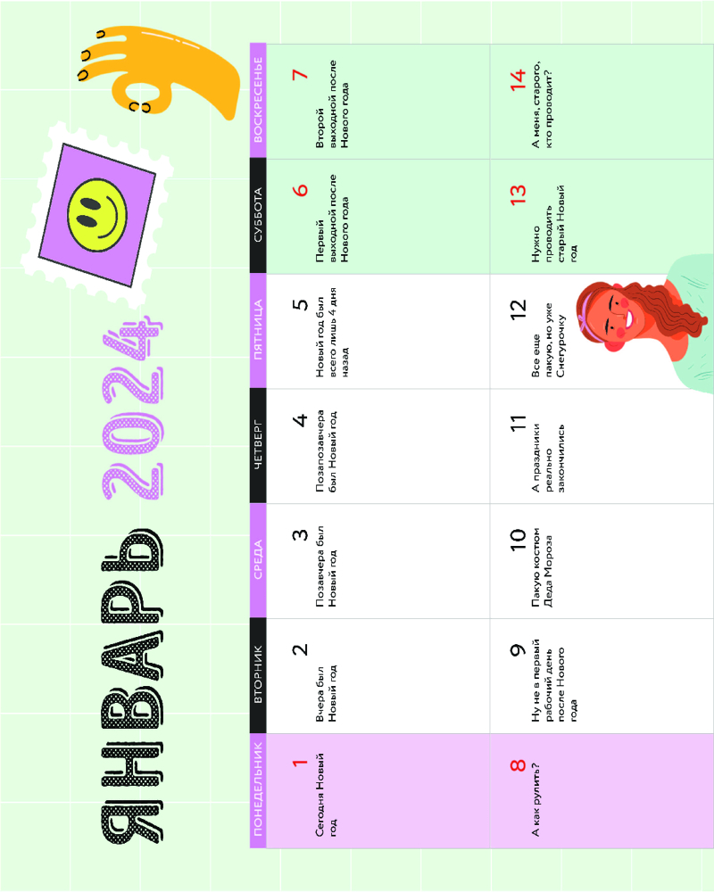 Сколько раз вам предлагали делать то, что вам не хочется? Или идти куда-то, где вам будет скучно? Чтобы лишний раз вам не приходилось напрягать мозг и сочинять отмазки, мы сделали это за вас! Каждый день — новая отмазка, которая подойдет для самых разных случаев. Не вписывайтесь в сомнительные мероприятия, отмазывайтесь красиво и иронично вместе с нашим календарем. Также такой календарь станет прекрасным подарком для друзей, которые игнорируют встречи с вами и нелепо придумывают оправдания. Добавьте креатива в их жизнь!