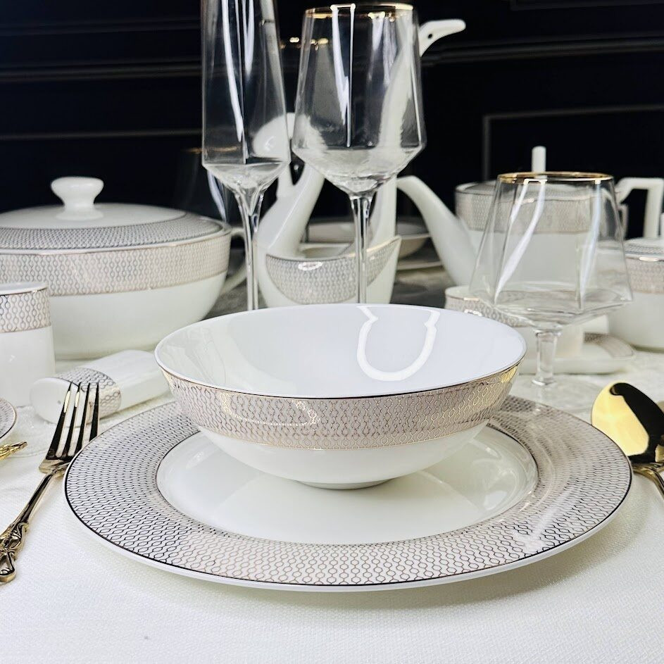 Серия: Севилья Новая коллекция посуды из костяного фарфора «Севилья». Тонкая и полупрозрачная с изящным золотым декором. Коллекция представлена сервизами, кофейным и чайными наборами, а также отдельными предметами. Каждое изделие проходит несколько этапов контроля качества на фабрике, что гарантирует его безупречное состояние и долговечность. Вы можете быть уверены в том, что эта посуда прослужит вам долгие годы, радуя вас своей красотой и функциональностью. Упаковано в подарочную коробку. |