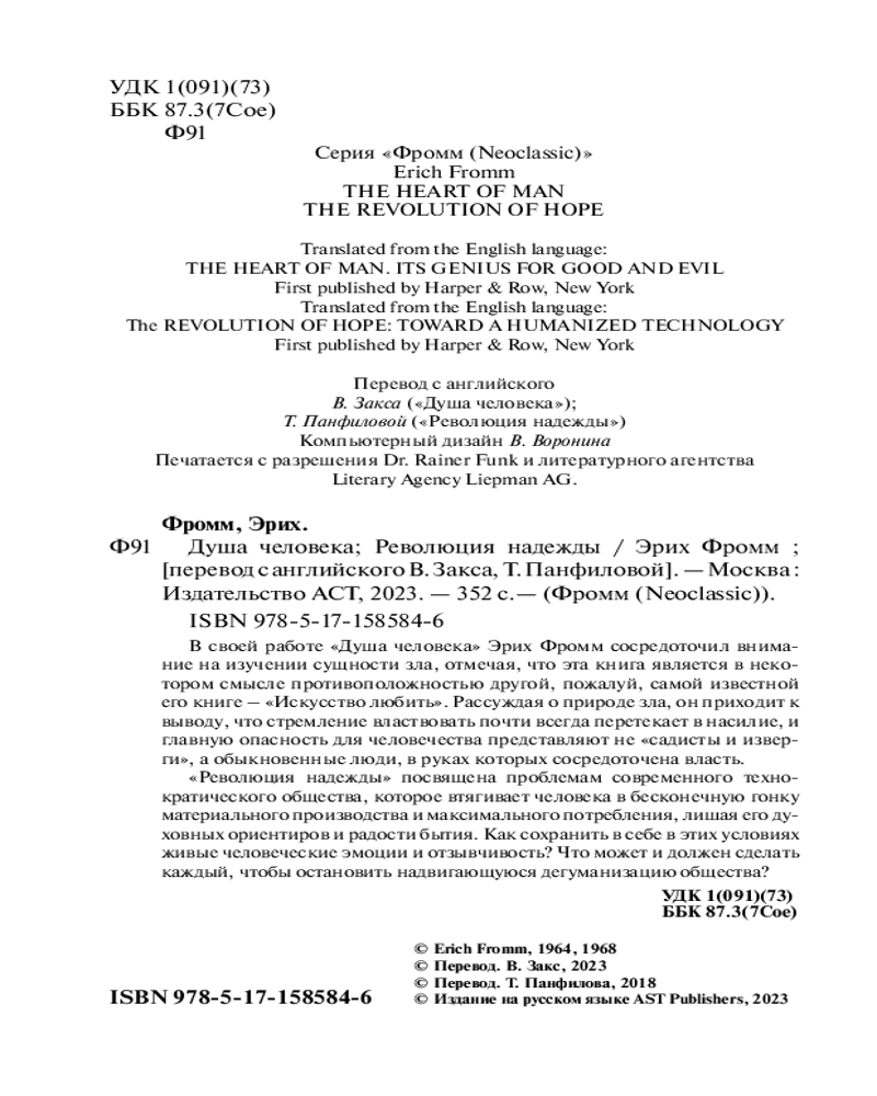 💳 Оплатить за товар можно при получении 🇰🇿 Есть бесплатная доставка по Казахстану 🎁 Копите бонусы с каждой покупки Серия: Фромм (Neoclassic) В своей работе «Душа человека» Эрих Фромм сосредоточил внимание на изучении сущности зла, отмечая, что эта книга является в некотором смысле противоположностью другой, пожалуй, самой известной его книге — «Искусство любить». Рассуждая о природе зла, он приходит к выводу, что стремление властвовать почти всегда перетекает в насилие, и главную опасность для человечества представляют не «садисты и изверги», а обыкновенные люди, в руках которых сосредоточена власть. |