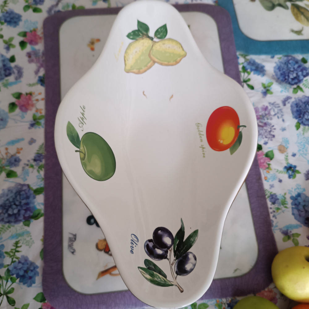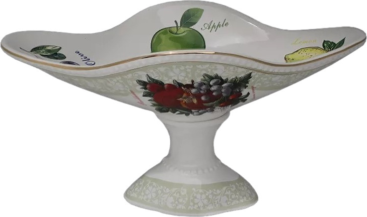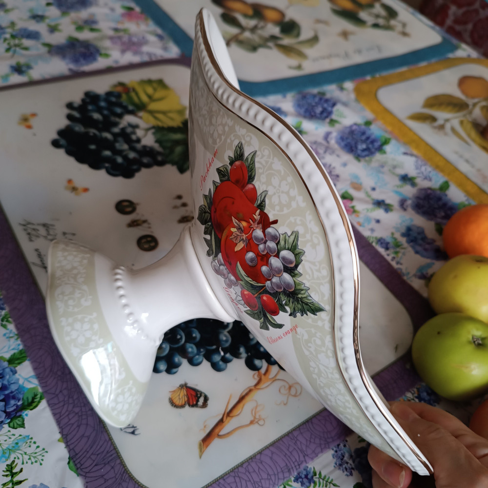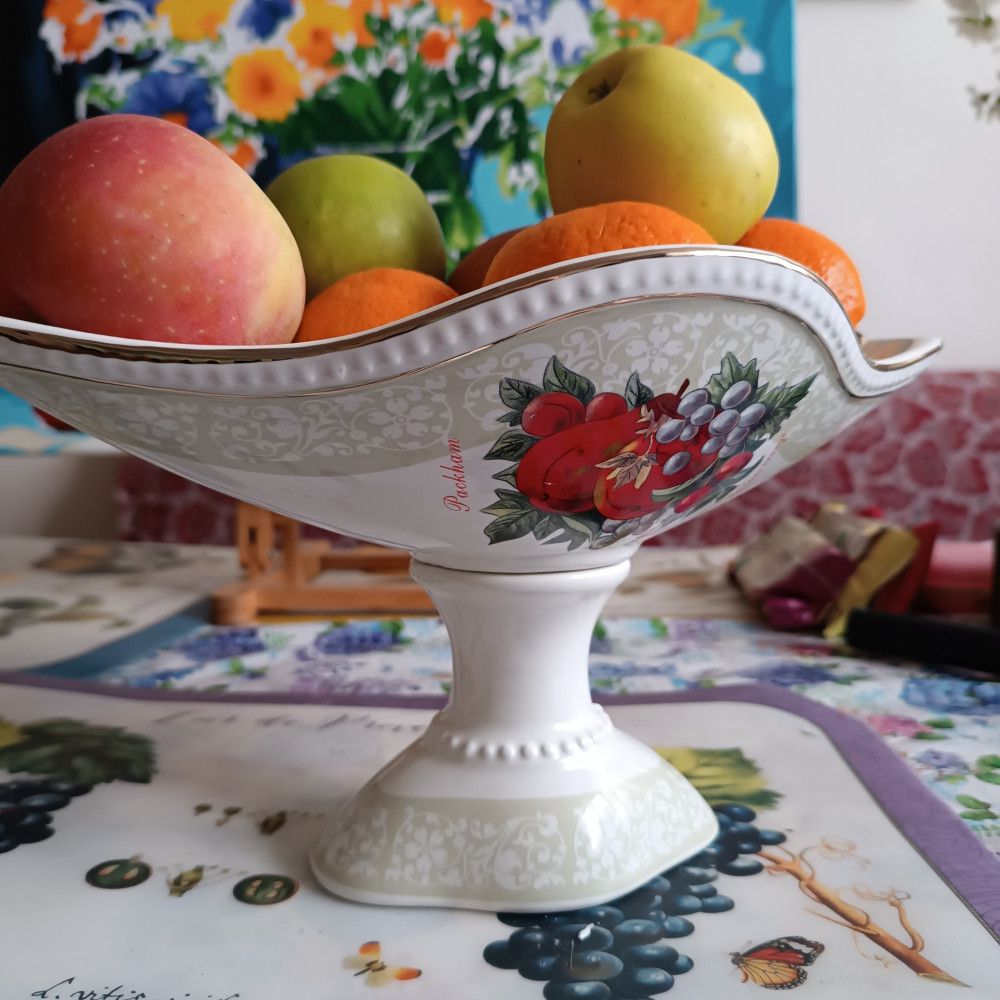 Красивая фруктовница, выполнена качественно, пришла без повреждений, упакована в большую коробку, обложена пенопластом. Форма мне не очень понравилась, длинная и узкая. Для винограда, может абрикос хорошо будет смотреться. Для крупных, круглых фруктов маловместительна и красиво уложить у меня не получается.