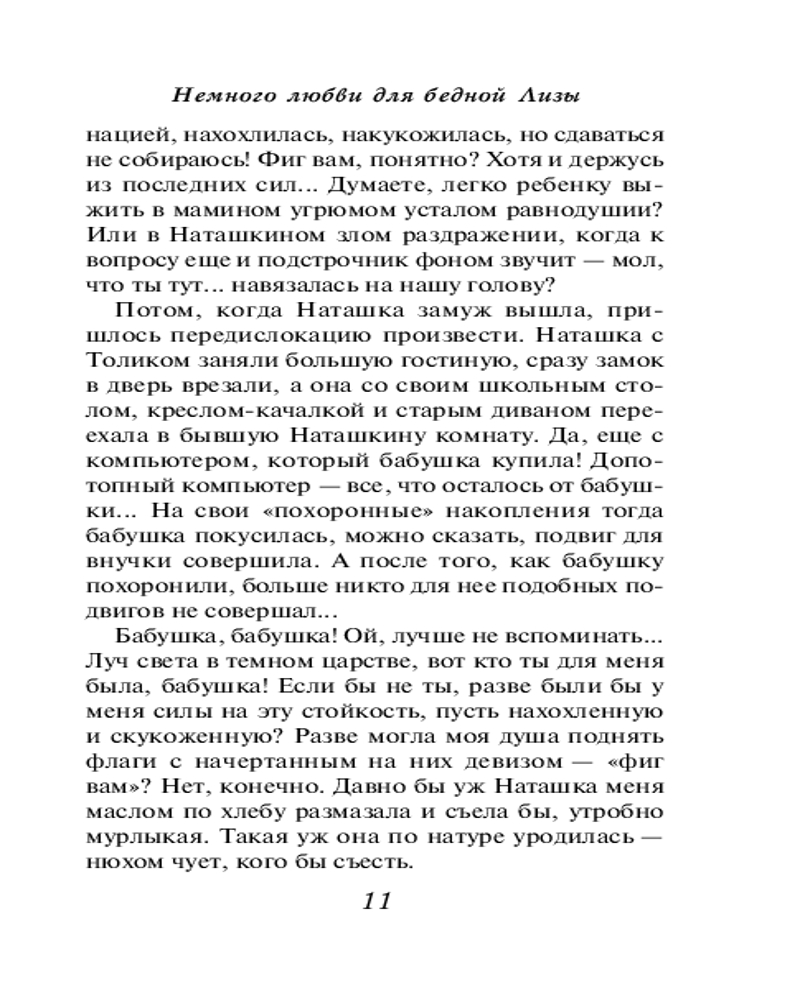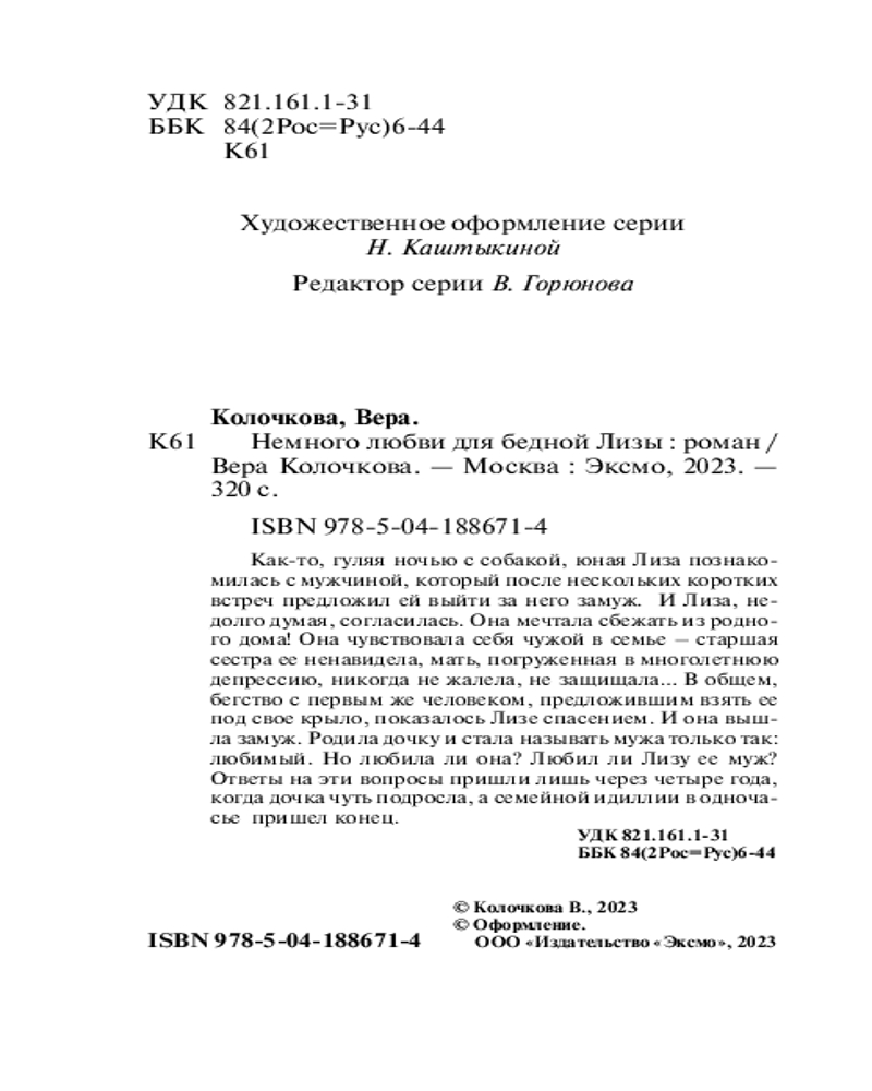 Немного любви для бедной Лизылегкость чтения интересный сюжет В данный момент этот товар отсутствует в продаже. Возможно, у нас найдется аналогичный или похожий товар здесь. Серия: Секреты женского счастья. Проза Веры Колочковой (обложка) Библиография Веры Колочковой насчитывает более 40 романов, многие из которых уже воплощены на экране. Любовь к автору вполне объяснима, ведь она пишет об обычных людях, которые стремятся к лучшей жизни и борются за собственное счастье. Простые и чувственные, увлекательные и романтичные, романы Колочковой задевают за живое, заставляя сопереживать и радоваться героям как своим знакомым. |