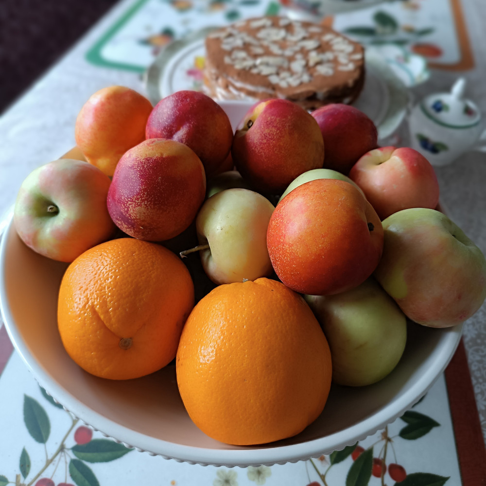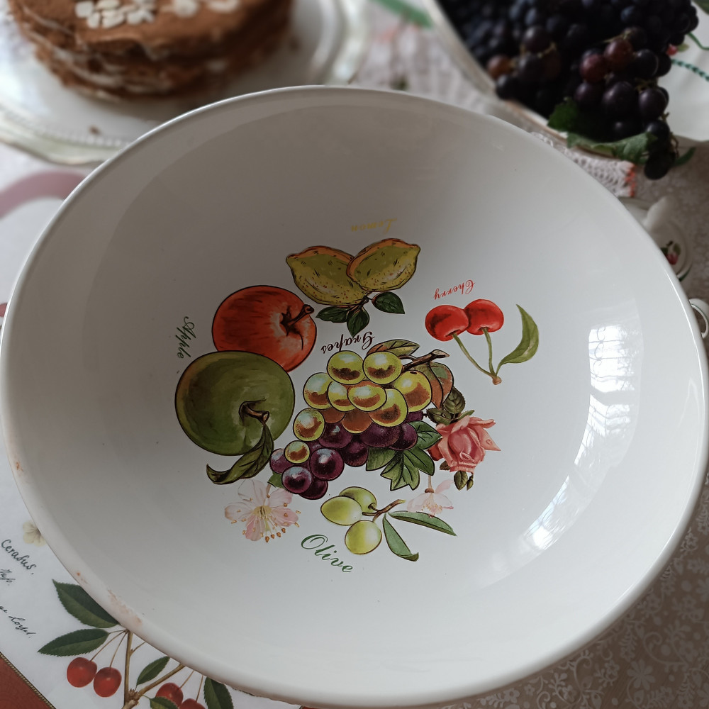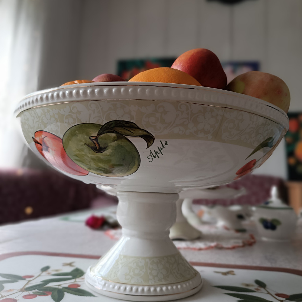 Фруктовница красивая большая, глубокая, хорошо подойдёт для крупных, круглых фруктов. До этого покупала фруктовницу удлиненной формы, небольшую, в которой хорошо смотрится виноград. Хотела большую для яблок, апельсин, крупных персиков. Наконец-то купила, спасибо за скидку. Фруктовница пришла тщательно упакованной в защитную плёнку, в коробке и пенопласте. Никаких изъянов не обнаружено, в идеальном состоянии. Хотя она и большая, но лёгкая. Вся посуда из этой линейки моя любовь.