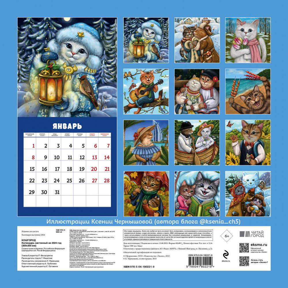 Календарь настенный на 2024 год «Кошгород»В данный момент этот товар отсутствует в продаже. Возможно, у нас найдется аналогичный или похожий товар здесь. Серия: Календари настенные 2024 (300×300) Практичный и эстетичный календарь будет радовать вас каждый день. Прекрасные иллюстрации органично дополнят любой интерьер и помогут грамотно спланировать свой день, неделю, месяц и год. Для всех поклонников наших хвостатых и усатых друзей. Вы попадете в город, который населен кошками и котами. Его пушистые и хвостатые жители носят шапки, пьют горячий чай, греют лапки в варежках, ходят на работу, читают детям сказки на ночь и даже празднуют Новый год! С каждым новым месяцем вас будет радовать портрет нового котика из прекрасного города Кошгород! |