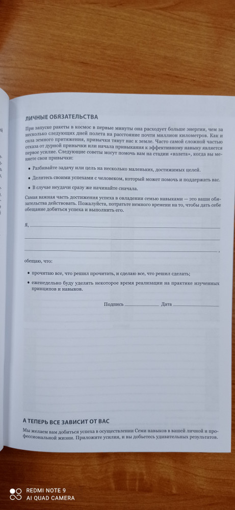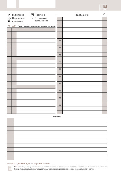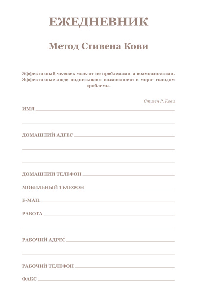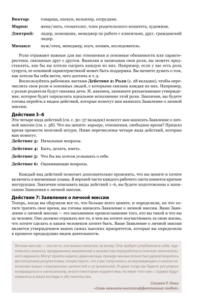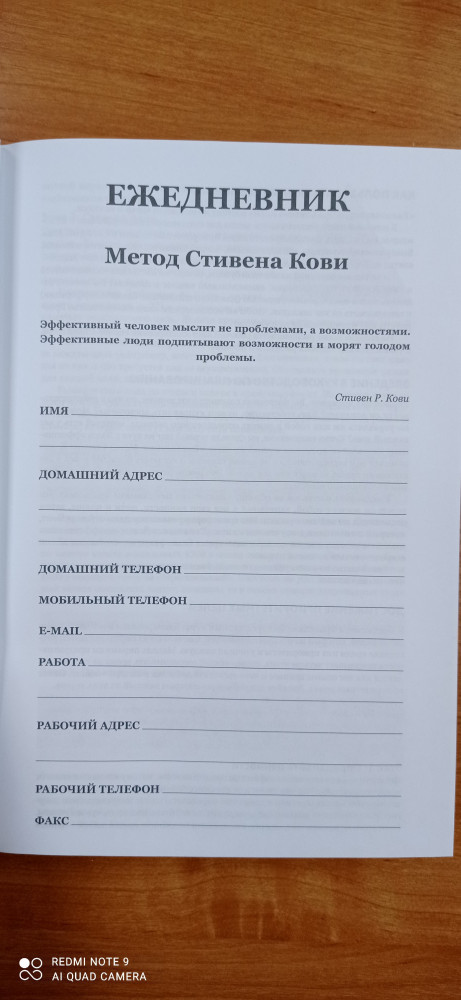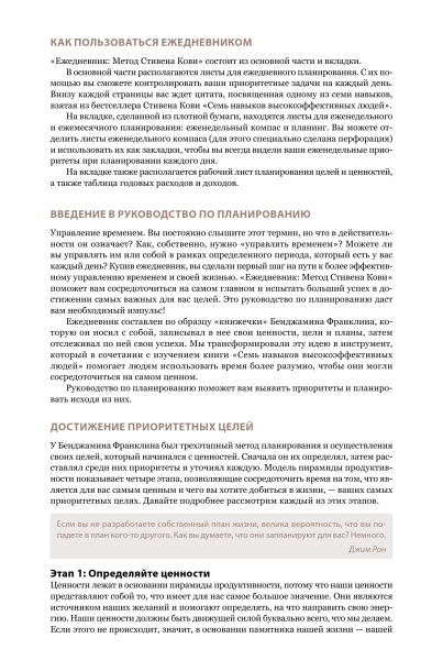 В общем, заказал я ежедневник в предвкушении, что стану успешным человеком, живя по нему. Очень благодарен авторам за попытку упорядочить нашу жизнь. И тут моя ошибка, что я не отдал должного внимания названию,что это ежеДНЕВник а не ежеНЕДЕЛЬник по Стивену Кови. Я то после прочтения книги хотел бы именно ежеНЕДЕЛЬник по образцу таблицы планирования на неделю в книге. Чтобы разобраться в этом ежедневнике мне пришлось поломать голову, наверное, причина во мне)) Там, конечно, есть упражнения по Стивену Кови для определения ролей и т. д., но нет такой таблицы на неделю, как в книге "7 навыков", в которой есть обзор на всю неделю, и чувствуешь простор. Было бы круто, если бы их добавили между днями недели. Что мне нравится, ежедневник очень круто и богато выглядит, оформлен красиво. Конечно, я не спец в ежедневниках, и это первая моя покупка. И это мое первое впечатление, через год посмотрим, может свыкнемся, а что теперь делать)) Из минусов то, что он большой как книга нормальная такая... Было бы круто, если бы авторы сделали именно еженедельник по Стивену Кови))