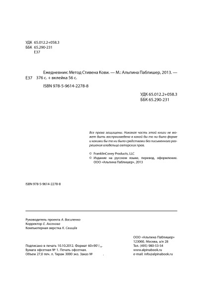 Ежедневник: Метод Стивена КовиВ данный момент этот товар отсутствует в продаже. Возможно, у нас найдется аналогичный или похожий товар здесь. Управление временем. Вы постоянно слышите этот термин, но что в действительности он означает? Как, собственно, нужно «управлять временем»? Можете ли вы управлять им или собой в рамках определенного периода, который есть у вас каждый день? Купив ежедневник, вы сделали первый шаг на пути к более эффективному управлению временем и своей жизнью. «Ежедневник: Метод Стивена Кови» поможет вам сосредоточиться на самом главном и испытать больший успех в достижении самых важных для вас целей. Это руководство по планированию даст вам необходимый импульс! |