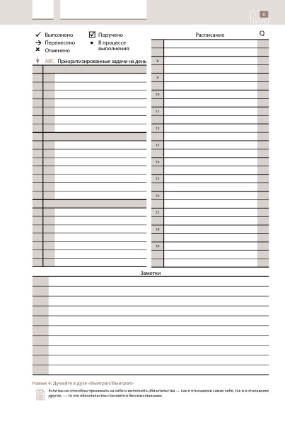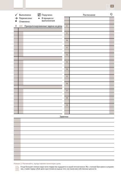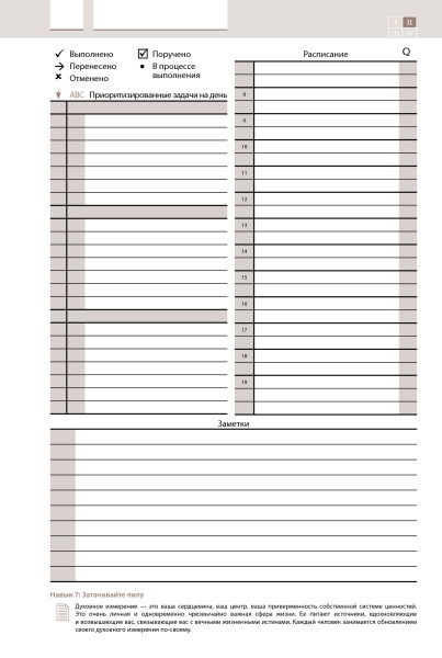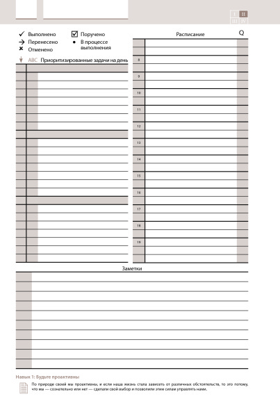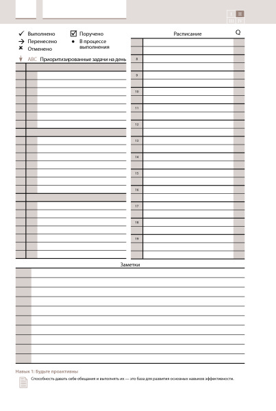 Ежедневник хороший и подходит тем, кто занимается и улучшает свою жизнь с советами от Кови. Не зажимает во временные рамки, а дает возможность гибко распоряжаться временем в зависимости от первоочередности, ведь не всегда точно знаешь сколько займет та или другая задача, человеческий фактор и тд. Полезная вещь.