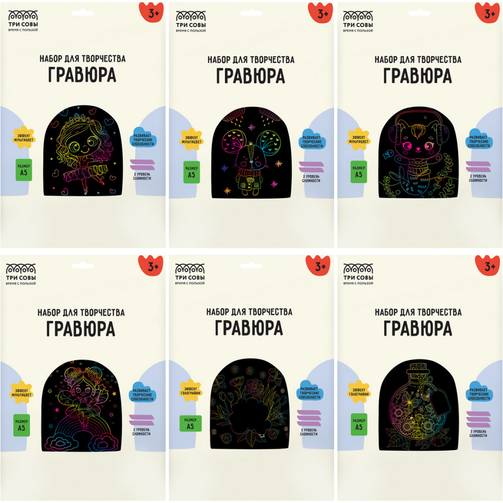 Набор гравюр — это увлекательный, популярный, а главное несложный вид творчества, который будет интересен не только детям, но и взрослым. В набор входят основы с эффектом мультицвета и голографии формата А5, штихель и крепление на стену.