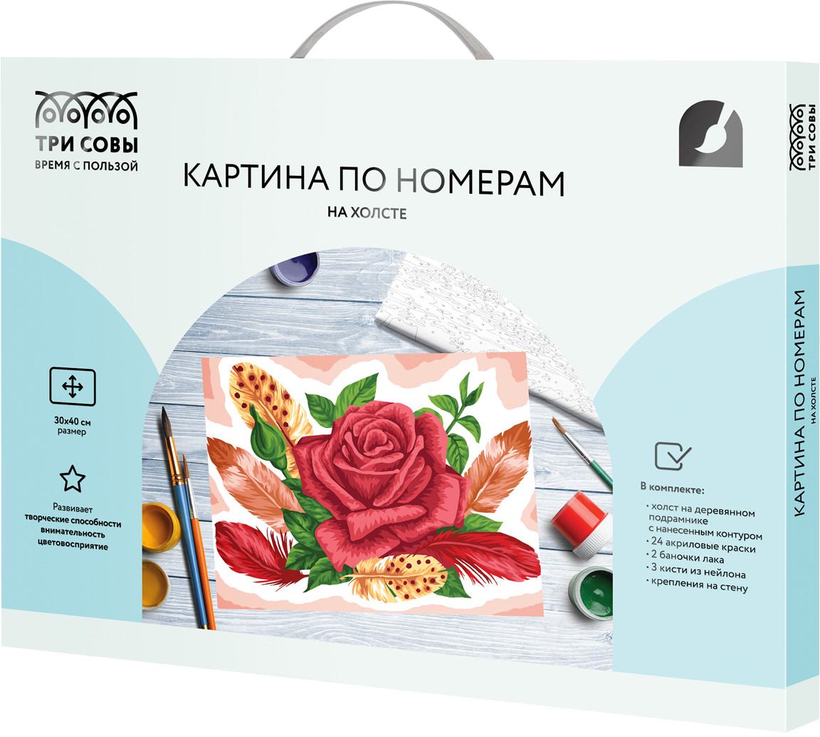 • холст на деревянном подрамнике 30×40 см с нанесенным контуром, пронумерованный в соответствии с номерами красок. Контур под раскрашивание нанесен в том числе и на торцы подрамника, что позволяет разместить готовую работу на стене не обрамляя в багет или раму. Технология точной разбивки сюжета картины на разные цветовые оттенки гарантируют правильность исполнения полотна;