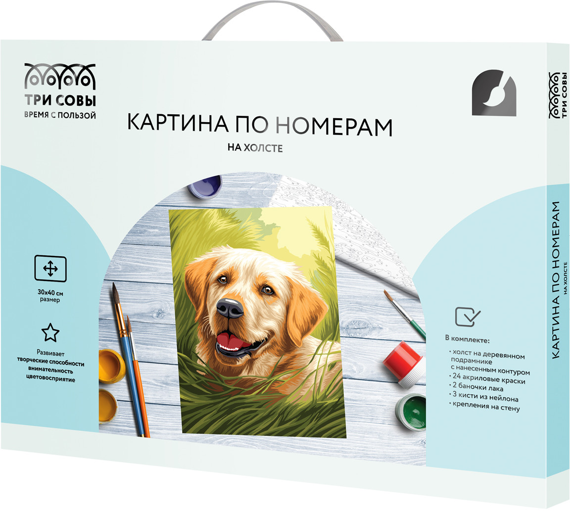 • холст на деревянном подрамнике 30×40 см с нанесенным контуром, пронумерованный в соответствии с номерами красок. Контур под раскрашивание нанесен в том числе и на торцы подрамника, что позволяет разместить готовую работу на стене не обрамляя в багет или раму. Технология точной разбивки сюжета картины на разные цветовые оттенки гарантируют правильность исполнения полотна;