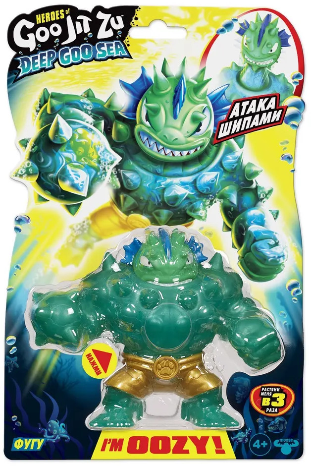 Высота фигурки — 12 см. Фугу наполнен жидким наполнителем с мини-фигурками в морской тематике. При сжатии фигурки голова выдвигается вверх. Нижняя часть туловища выполнена из жесткого пластика для устойчивости фигурки при действии функции «Атака шипами».